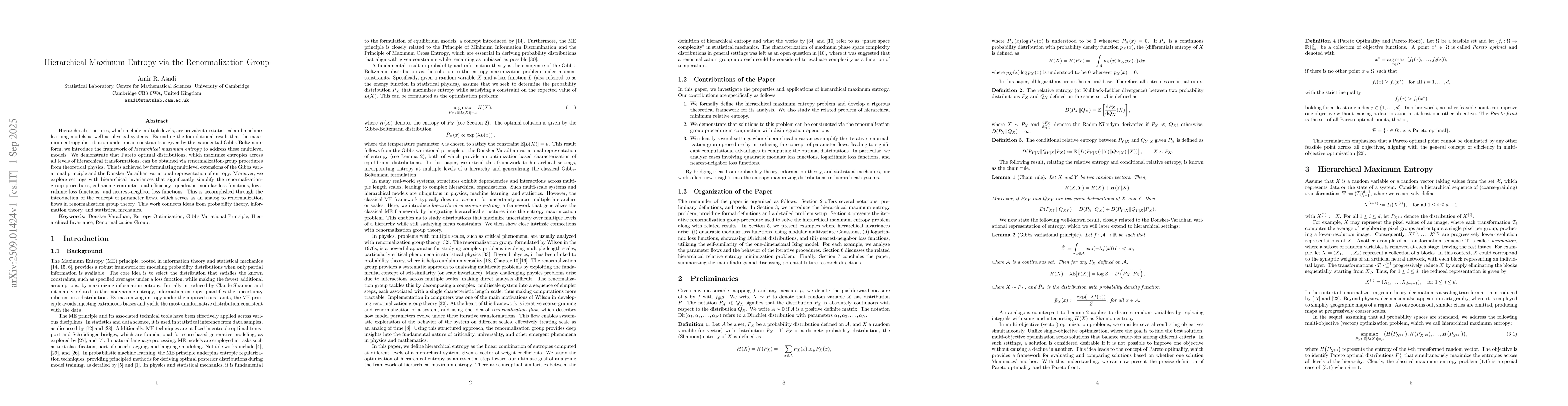 Hierarchical structures, which include multiple levels, are prevalent in statistical and machine-learning models as well as physical systems. Extending the foundational result that the maximum entropy distribution under mean constraints is given by the exponential Gibbs-Boltzmann form, we introduce the framework of "hierarchical maximum entropy" to address these multilevel models. We demonstrate that Pareto optimal distributions, which maximize entropies across all levels of hierarchical transformations, can be obtained via renormalization-group procedures from theoretical physics. This is achieved by formulating multilevel extensions of the Gibbs variational principle and the Donsker-Varadhan variational representation of entropy. Moreover, we explore settings with hierarchical invariances that significantly simplify the renormalization-group procedures, enhancing computational efficiency: quadratic modular loss functions, logarithmic loss functions, and nearest-neighbor loss functions. This is accomplished through the introduction of the concept of parameter flows, which serves as an analog to renormalization flows in renormalization group theory. This work connects ideas from probability theory, information theory, and statistical mechanics.