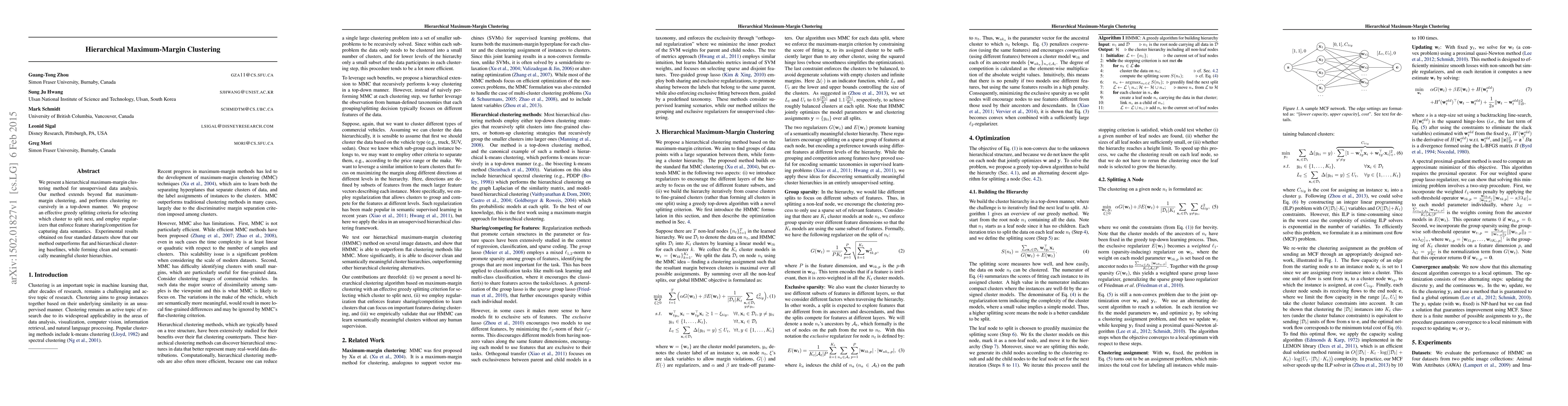 This paper introduces a hierarchical maximum-margin clustering method for unsupervised data analysis that recursively clusters data in a top-down manner, employing a greedy splitting criteria and regularizers for feature sharing/competition. The method outperforms both flat and hierarchical clustering baselines on standard datasets.