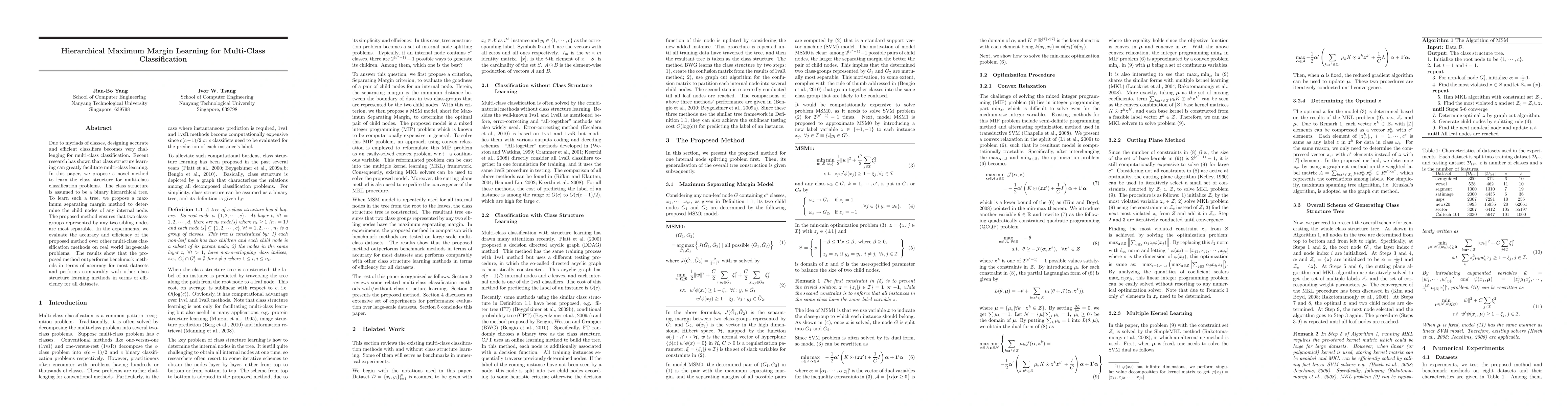 This paper proposes a hierarchical maximum margin learning method for multi-class classification using a binary tree structure to represent class relationships, achieving higher accuracy compared to benchmark methods while maintaining competitive efficiency. Experimental results on large-scale datasets demonstrate the effectiveness of the proposed method.