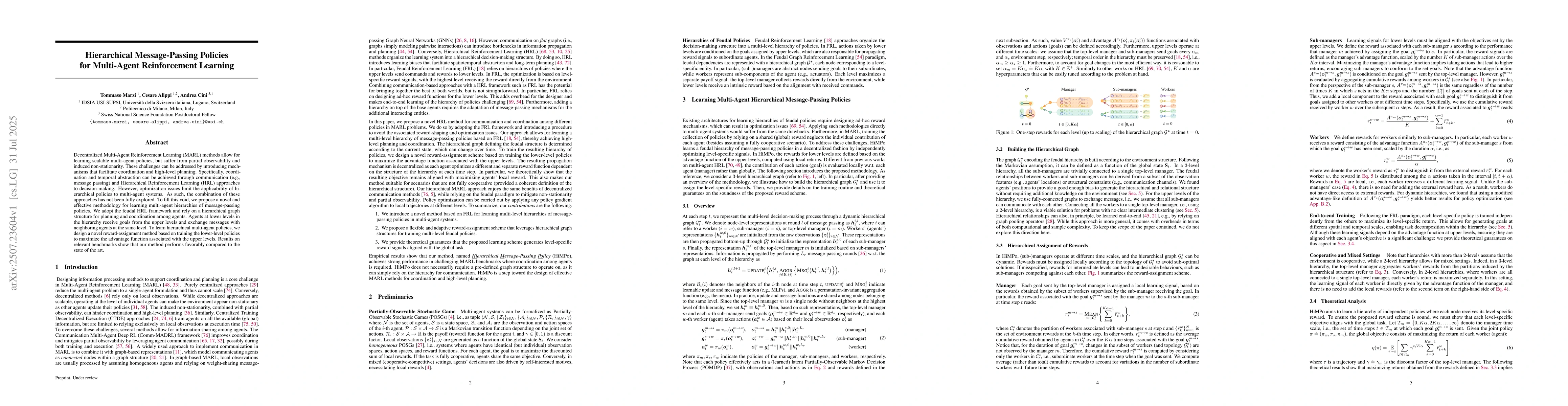 Decentralized Multi-Agent Reinforcement Learning (MARL) methods allow for learning scalable multi-agent policies, but suffer from partial observability and induced non-stationarity. These challenges can be addressed by introducing mechanisms that facilitate coordination and high-level planning. Specifically, coordination and temporal abstraction can be achieved through communication (e.g., message passing) and Hierarchical Reinforcement Learning (HRL) approaches to decision-making. However, optimization issues limit the applicability of hierarchical policies to multi-agent systems. As such, the combination of these approaches has not been fully explored. To fill this void, we propose a novel and effective methodology for learning multi-agent hierarchies of message-passing policies. We adopt the feudal HRL framework and rely on a hierarchical graph structure for planning and coordination among agents. Agents at lower levels in the hierarchy receive goals from the upper levels and exchange messages with neighboring agents at the same level. To learn hierarchical multi-agent policies, we design a novel reward-assignment method based on training the lower-level policies to maximize the advantage function associated with the upper levels. Results on relevant benchmarks show that our method performs favorably compared to the state of the art.