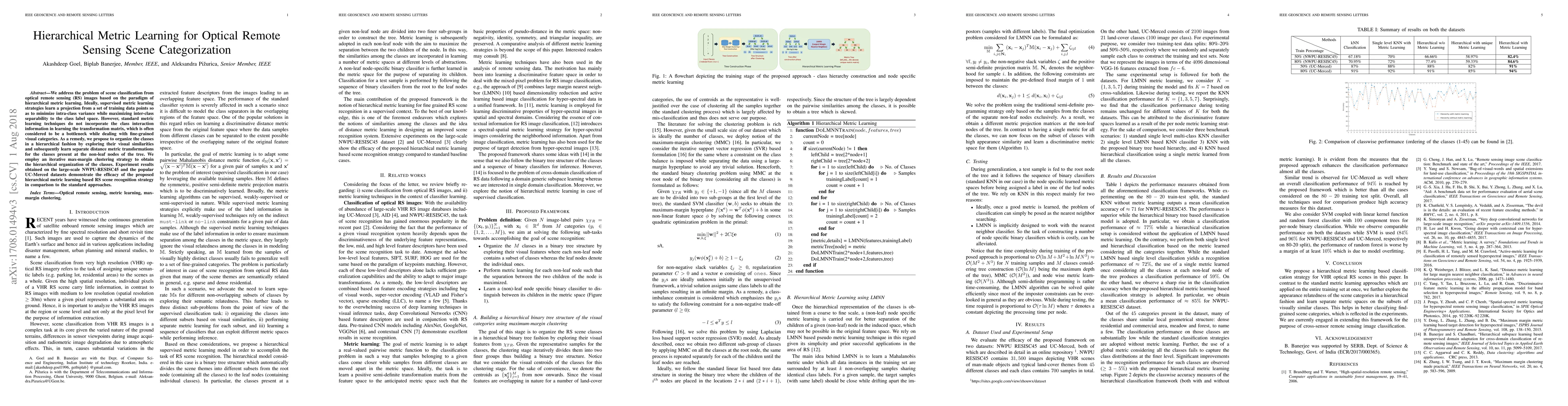 We address the problem of scene classification from optical remote sensing (RS) images based on the paradigm of hierarchical metric learning. Ideally, supervised metric learning strategies learn a projection from a set of training data points so as to minimize intra-class variance while maximizing inter-class separability to the class label space. However, standard metric learning techniques do not incorporate the class interaction information in learning the transformation matrix, which is often considered to be a bottleneck while dealing with fine-grained visual categories. As a remedy, we propose to organize the classes in a hierarchical fashion by exploring their visual similarities and subsequently learn separate distance metric transformations for the classes present at the non-leaf nodes of the tree. We employ an iterative max-margin clustering strategy to obtain the hierarchical organization of the classes. Experiment results obtained on the large-scale NWPU-RESISC45 and the popular UC-Merced datasets demonstrate the efficacy of the proposed hierarchical metric learning based RS scene recognition strategy in comparison to the standard approaches.