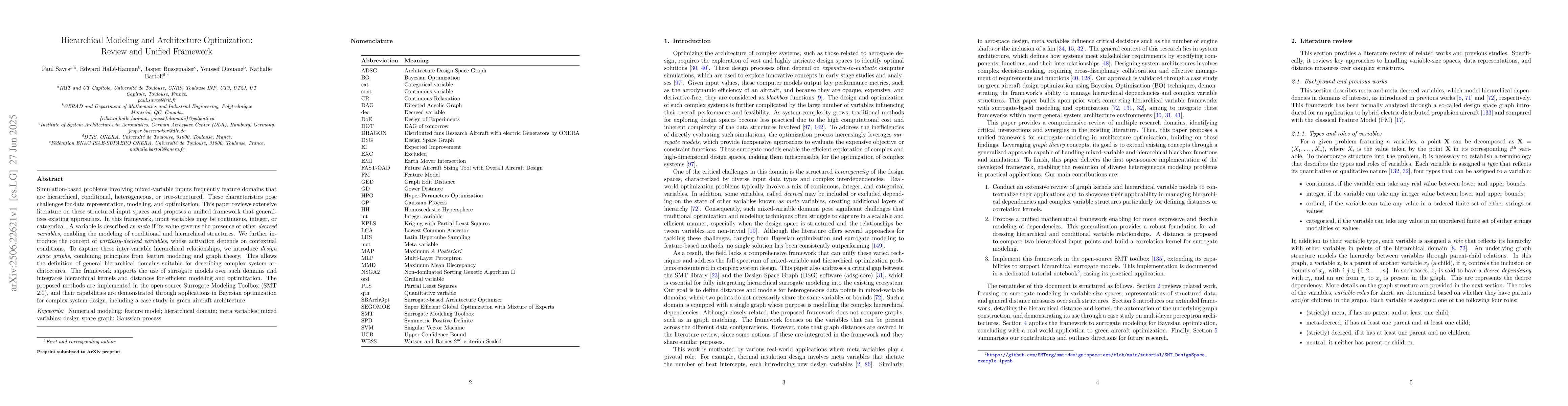 This paper proposes a unified framework for modeling and optimizing complex systems with hierarchical, conditional, and heterogeneous input spaces. It introduces 'meta' and 'partially-decreed' variables, and uses design space graphs to capture hierarchical relationships. The framework supports surrogate models and efficient optimization, demonstrated in applications like green aircraft architecture design.