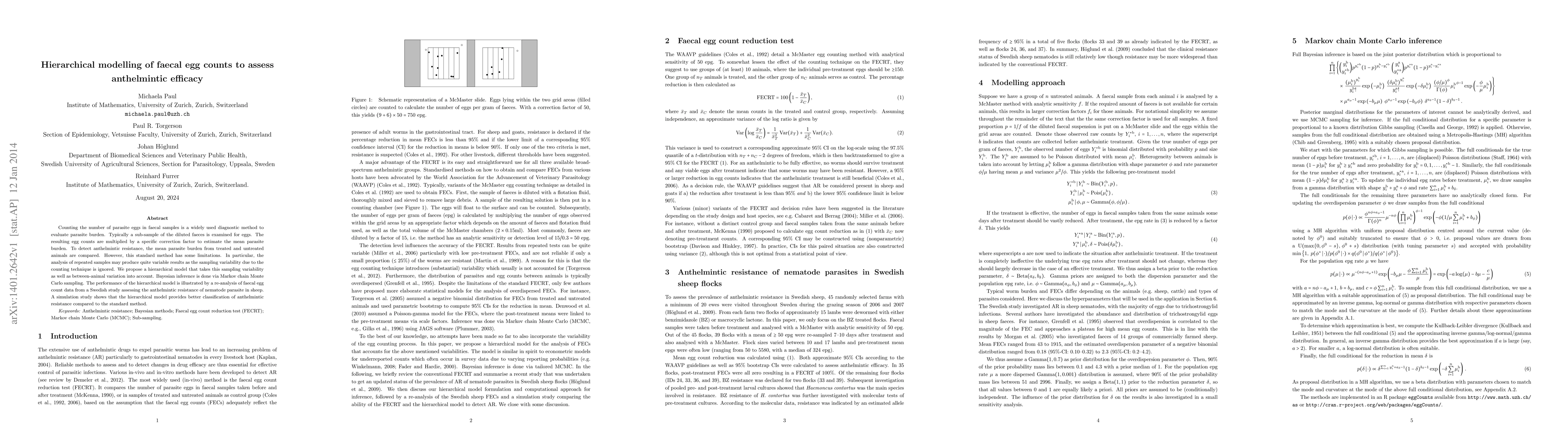 Counting the number of parasite eggs in faecal samples is a widely used diagnostic method to evaluate parasite burden. Typically a sub-sample of the diluted faeces is examined for eggs. The resulting egg counts are multiplied by a specific correction factor to estimate the mean parasite burden. To detect anthelmintic resistance, the mean parasite burden from treated and untreated animals are compared. However, this standard method has some limitations. In particular, the analysis of repeated samples may produce quite variable results as the sampling variability due to the counting technique is ignored. We propose a hierarchical model that takes this sampling variability as well as between-animal variation into account. Bayesian inference is done via Markov chain Monte Carlo sampling. The performance of the hierarchical model is illustrated by a re-analysis of faecal egg count data from a Swedish study assessing the anthelmintic resistance of nematode parasite in sheep. A simulation study shows that the hierarchical model provides better classification of anthelmintic resistance compared to the standard method.