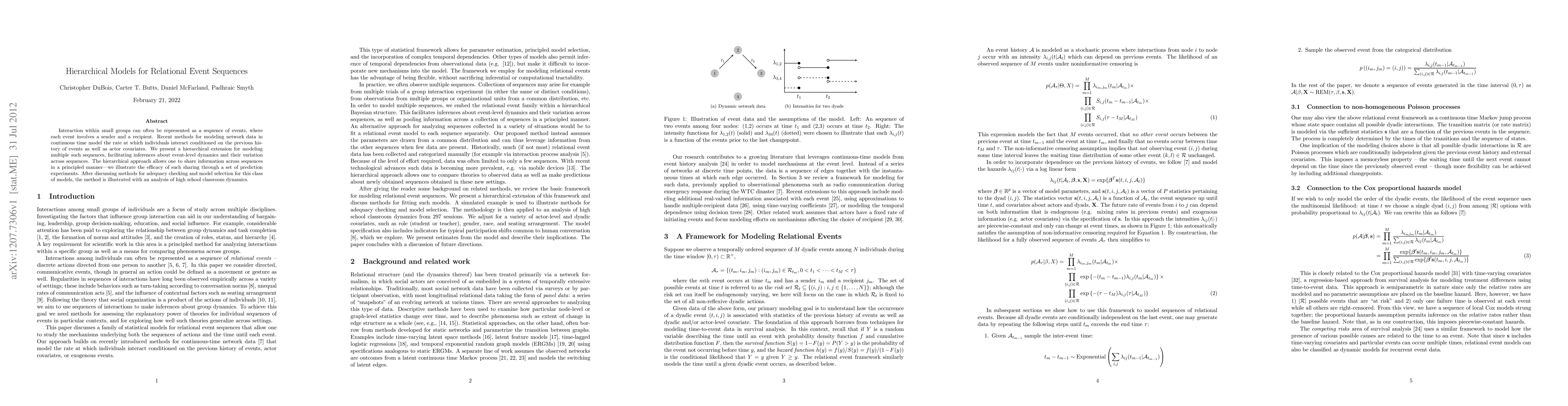 This paper introduces a hierarchical model for analyzing sequences of relational events in small groups, enabling inferences about event dynamics and their variations across different sequences. The approach shares information across sequences to improve predictions, demonstrated through an analysis of high school classroom interactions.