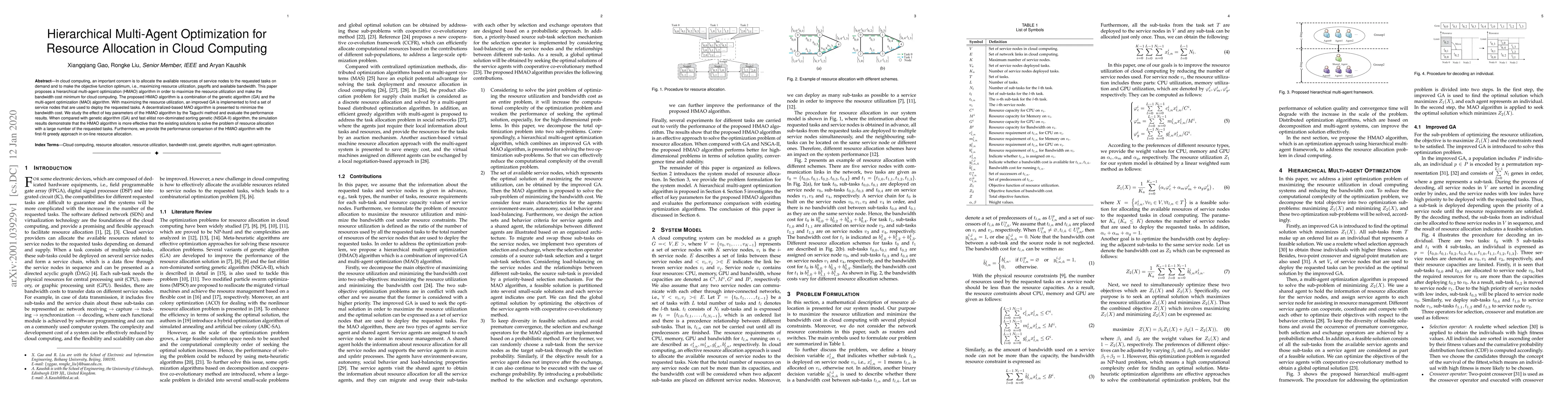 This paper introduces a hierarchical multi-agent optimization (HMAO) algorithm for optimizing resource allocation in cloud computing, combining genetic algorithms and multi-agent optimization to maximize resource utilization and minimize bandwidth costs. Simulation results show that HMAO outperforms existing algorithms like GA and NSGA-II in handling large task allocations.