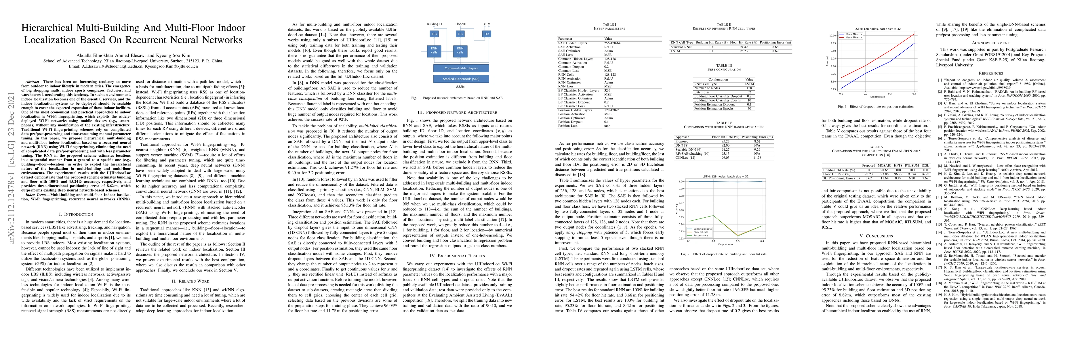 This paper proposes a hierarchical indoor localization method using recurrent neural networks (RNNs) for multi-building and multi-floor environments based on Wi-Fi fingerprinting, eliminating complex data processing and manual parameter tuning. The RNN estimates locations sequentially, achieving 100% accuracy for building identification and 95.24% for floor identification, with a three-dimensional positioning error of 8.62 m, outperforming existing deep learning methods.