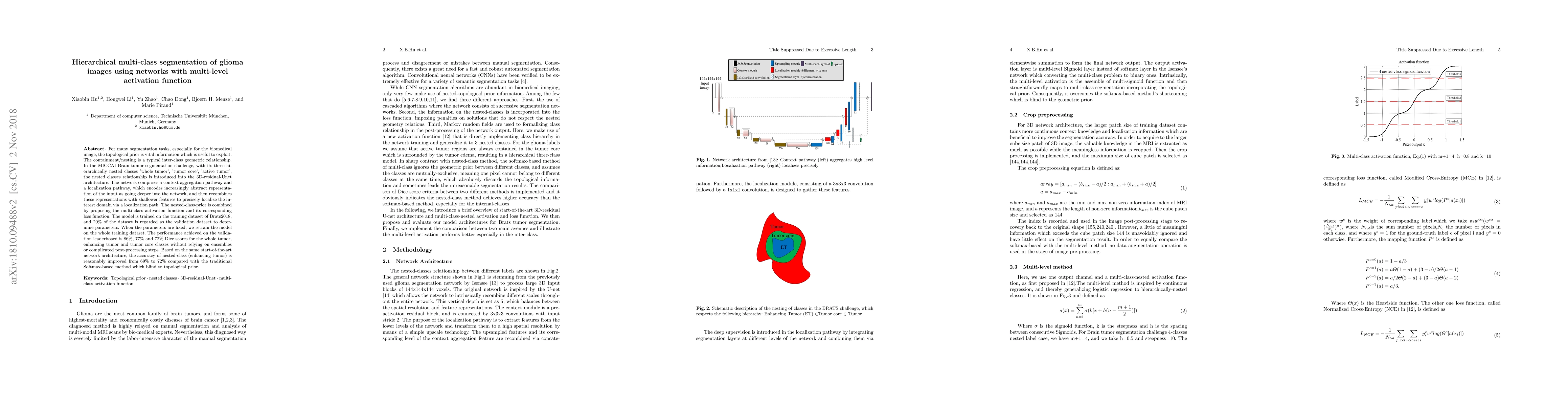 For many segmentation tasks, especially for the biomedical image, the topological prior is vital information which is useful to exploit. The containment/nesting is a typical inter-class geometric relationship. In the MICCAI Brain tumor segmentation challenge, with its three hierarchically nested classes 'whole tumor', 'tumor core', 'active tumor', the nested classes relationship is introduced into the 3D-residual-Unet architecture. The network comprises a context aggregation pathway and a localization pathway, which encodes increasingly abstract representation of the input as going deeper into the network, and then recombines these representations with shallower features to precisely localize the interest domain via a localization path. The nested-class-prior is combined by proposing the multi-class activation function and its corresponding loss function. The model is trained on the training dataset of Brats2018, and 20% of the dataset is regarded as the validation dataset to determine parameters. When the parameters are fixed, we retrain the model on the whole training dataset. The performance achieved on the validation leaderboard is 86%, 77% and 72% Dice scores for the whole tumor, enhancing tumor and tumor core classes without relying on ensembles or complicated post-processing steps. Based on the same start-of-the-art network architecture, the accuracy of nested-class (enhancing tumor) is reasonably improved from 69% to 72% compared with the traditional Softmax-based method which blind to topological prior.