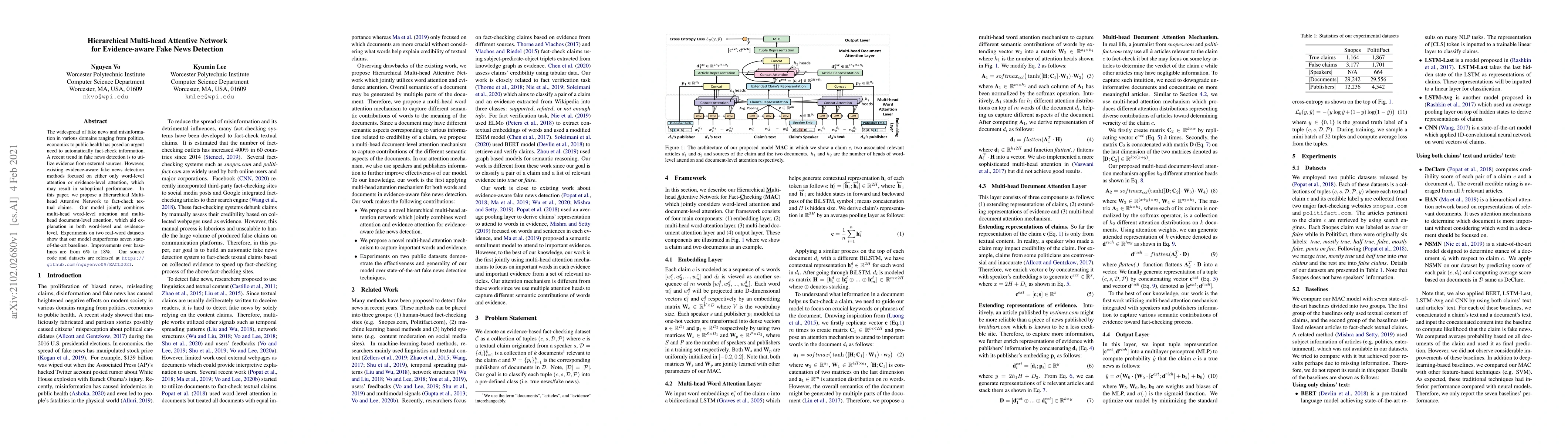 This paper proposes a Hierarchical Multi-head Attentive Network that integrates both word-level and evidence-level attention for effective fake news detection. The model outperforms state-of-the-art baselines by 6% to 18% on real-world datasets.
