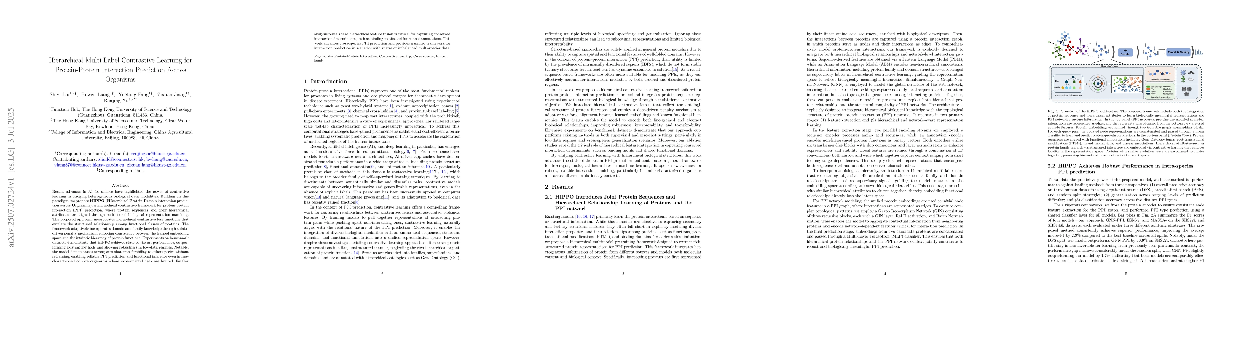 Recent advances in AI for science have highlighted the power of contrastive learning in bridging heterogeneous biological data modalities. Building on this paradigm, we propose HIPPO (HIerarchical Protein-Protein interaction prediction across Organisms), a hierarchical contrastive framework for protein-protein interaction(PPI) prediction, where protein sequences and their hierarchical attributes are aligned through multi-tiered biological representation matching. The proposed approach incorporates hierarchical contrastive loss functions that emulate the structured relationship among functional classes of proteins. The framework adaptively incorporates domain and family knowledge through a data-driven penalty mechanism, enforcing consistency between the learned embedding space and the intrinsic hierarchy of protein functions. Experiments on benchmark datasets demonstrate that HIPPO achieves state-of-the-art performance, outperforming existing methods and showing robustness in low-data regimes. Notably, the model demonstrates strong zero-shot transferability to other species without retraining, enabling reliable PPI prediction and functional inference even in less characterized or rare organisms where experimental data are limited. Further analysis reveals that hierarchical feature fusion is critical for capturing conserved interaction determinants, such as binding motifs and functional annotations. This work advances cross-species PPI prediction and provides a unified framework for interaction prediction in scenarios with sparse or imbalanced multi-species data.
