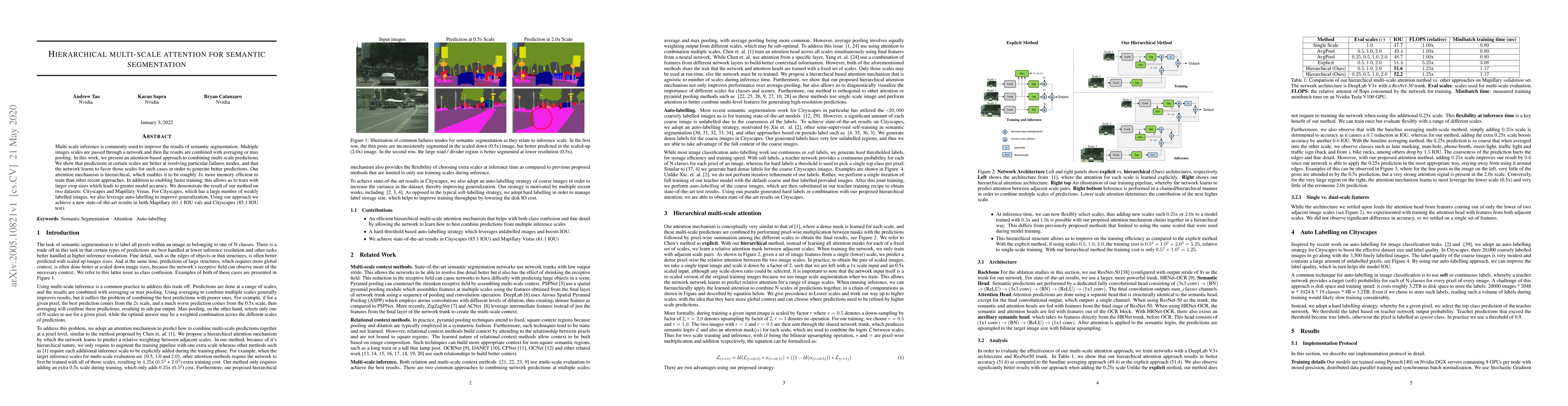 This paper introduces a hierarchical multi-scale attention mechanism for semantic segmentation, which selectively combines multi-scale predictions to resolve specific failure modes, achieving state-of-the-art results on Cityscapes and Mapillary Vistas datasets. The method is also shown to be significantly more memory efficient during training.