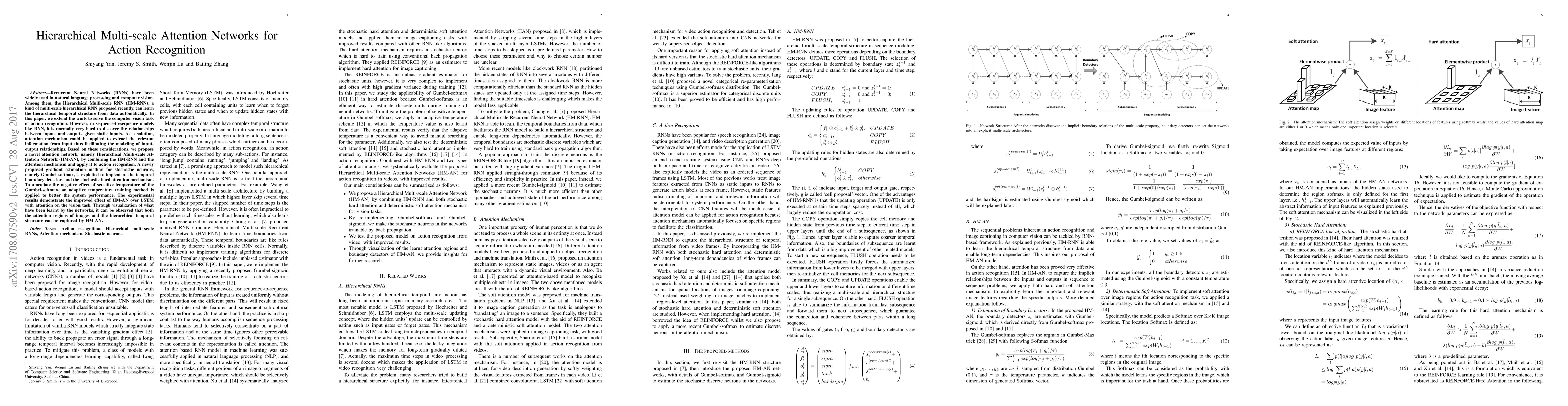 This paper proposes a Hierarchical Multi-scale Attention Network (HM-AN) that combines a Hierarchical Multi-scale RNN (HM-RNN) with an attention mechanism to enhance action recognition in computer vision. The HM-AN uses a Gumbel-softmax gradient estimation method and an adaptive temperature training technique to improve performance and attention accuracy.