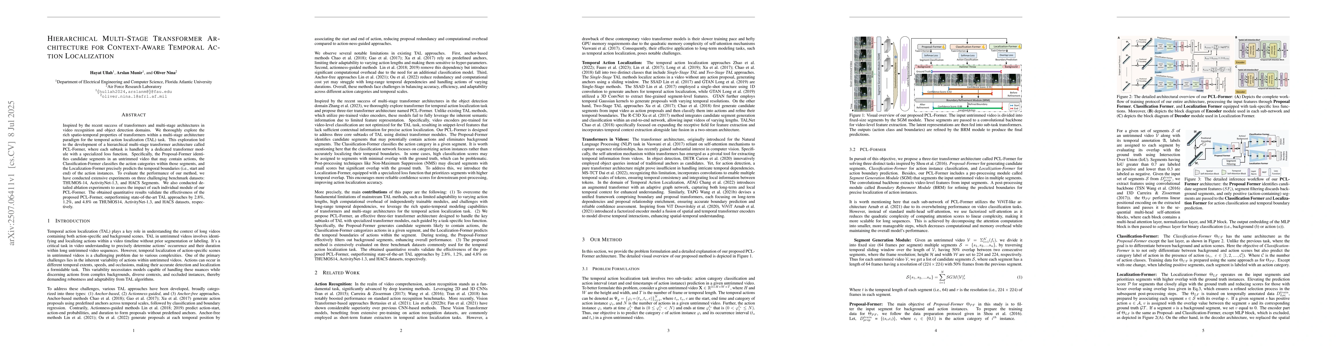 Inspired by the recent success of transformers and multi-stage architectures in video recognition and object detection domains. We thoroughly explore the rich spatio-temporal properties of transformers within a multi-stage architecture paradigm for the temporal action localization (TAL) task. This exploration led to the development of a hierarchical multi-stage transformer architecture called PCL-Former, where each subtask is handled by a dedicated transformer module with a specialized loss function. Specifically, the Proposal-Former identifies candidate segments in an untrimmed video that may contain actions, the Classification-Former classifies the action categories within those segments, and the Localization-Former precisely predicts the temporal boundaries (i.e., start and end) of the action instances. To evaluate the performance of our method, we have conducted extensive experiments on three challenging benchmark datasets: THUMOS-14, ActivityNet-1.3, and HACS Segments. We also conducted detailed ablation experiments to assess the impact of each individual module of our PCL-Former. The obtained quantitative results validate the effectiveness of the proposed PCL-Former, outperforming state-of-the-art TAL approaches by 2.8%, 1.2%, and 4.8% on THUMOS14, ActivityNet-1.3, and HACS datasets, respectively.