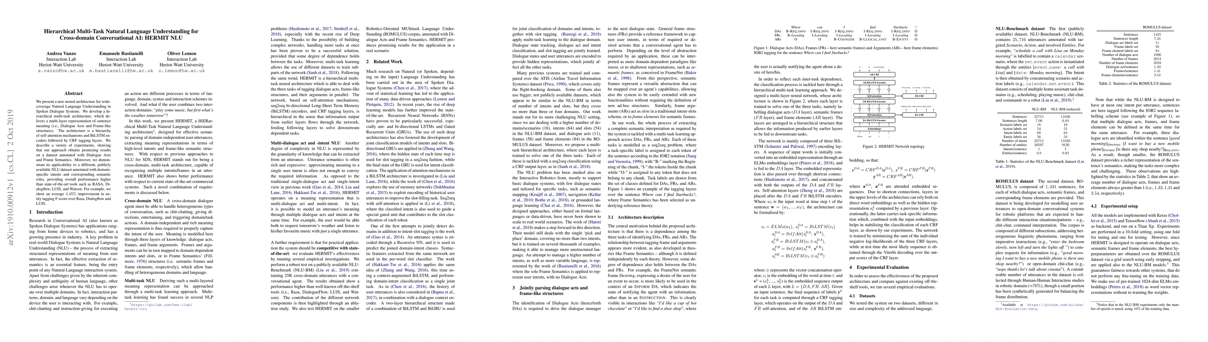This paper introduces HERMIT NLU, a hierarchical multi-task neural architecture for Natural Language Understanding in conversational AI, achieving superior performance on datasets with Dialogue Acts and Frame Semantics, and demonstrating notable improvements over existing tools like RASA and Dialogflow.