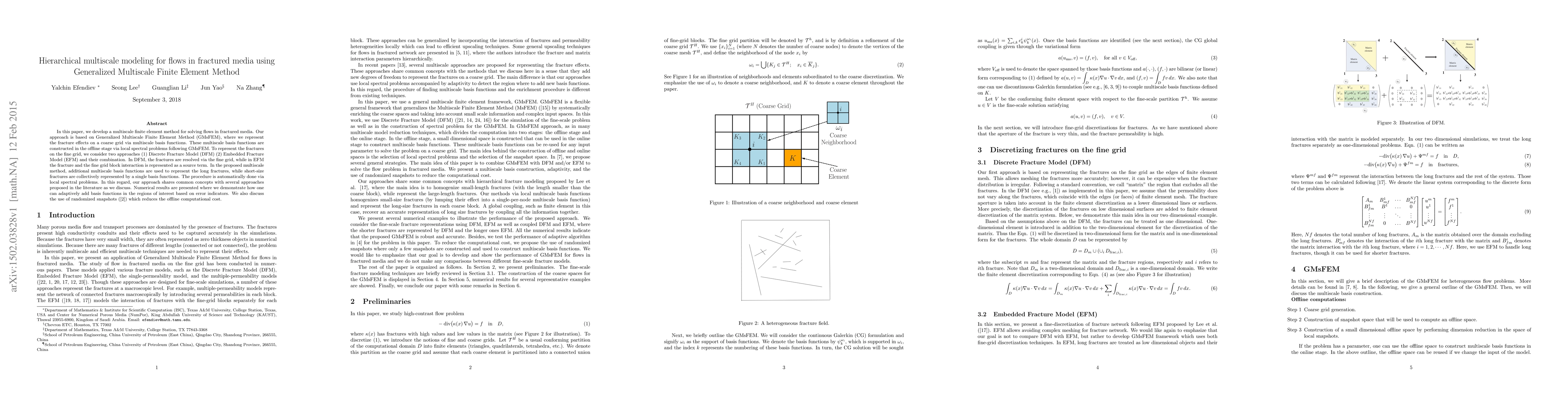 This paper develops a multiscale finite element method for simulating flows in fractured media using the Generalized Multiscale Finite Element Method (GMsFEM). It employs multiscale basis functions to represent fracture effects and combines Discrete Fracture Models (DFM) with Embedded Fracture Models (EFM) to handle fractures on different scales, demonstrating adaptive basis function addition and reduced offline costs via randomized snapshots.