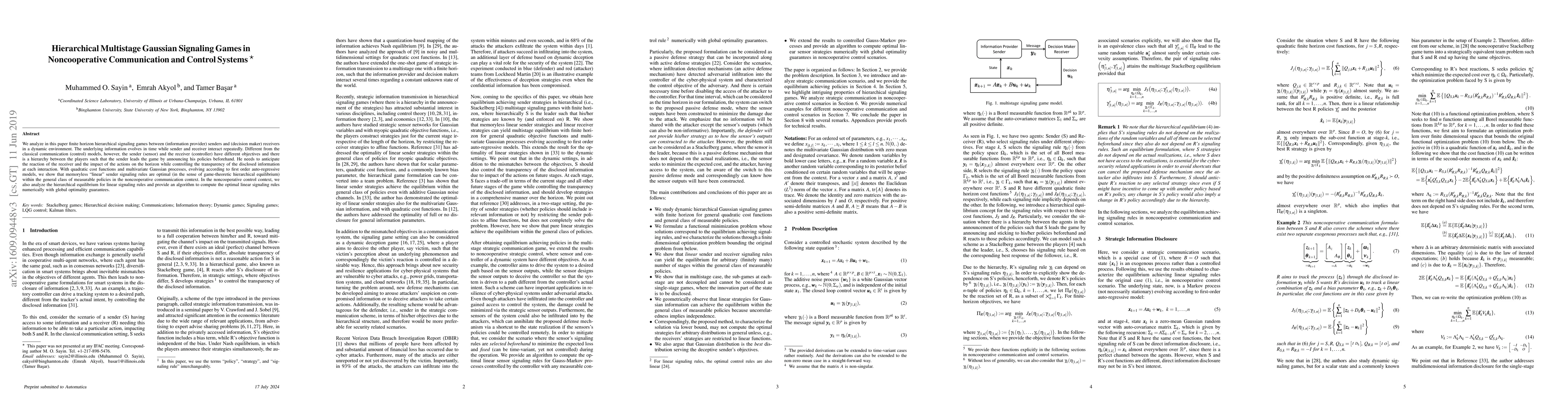 We analyze in this paper finite horizon hierarchical signaling games between (information provider) senders and (decision maker) receivers in a dynamic environment. The underlying information evolves in time while sender and receiver interact repeatedly. Different from the classical communication (control) models, however, the sender (sensor) and the receiver (controller) have different objectives and there is a hierarchy between the players such that the sender leads the game by announcing his policies beforehand. He needs to anticipate the reaction of the receiver and the impact of the actions on the horizon while controlling the transparency of the disclosed information at each interaction. With quadratic cost functions and multivariate Gaussian processes, evolving according to first order auto-regressive models, we show that memoryless "linear" sender signaling rules are optimal (in the sense of game-theoretic hierarchical equilibrium) within the general class of measurable policies in the noncooperative communication context. In the noncooperative control context, we also analyze the hierarchical equilibrium for linear signaling rules and provide an algorithm to compute the optimal linear signaling rules numerically with global optimality guarantees.
