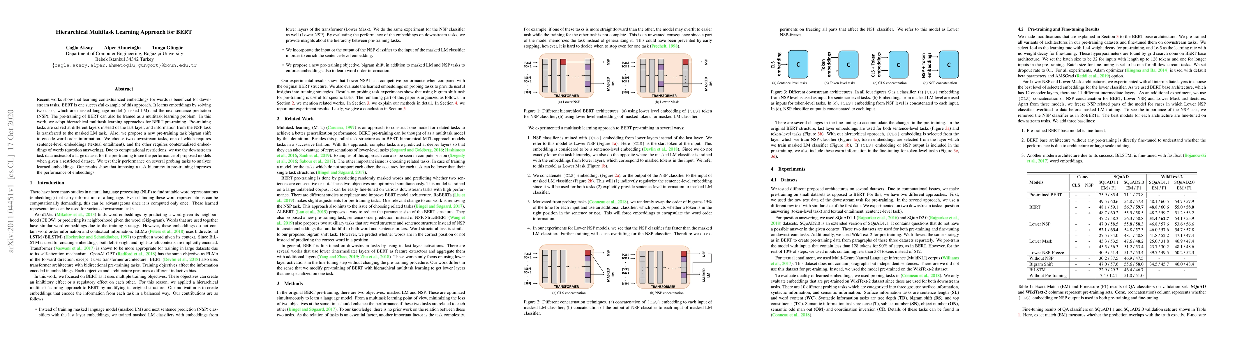 Recent works show that learning contextualized embeddings for words is beneficial for downstream tasks. BERT is one successful example of this approach. It learns embeddings by solving two tasks, which are masked language model (masked LM) and the next sentence prediction (NSP). The pre-training of BERT can also be framed as a multitask learning problem. In this work, we adopt hierarchical multitask learning approaches for BERT pre-training. Pre-training tasks are solved at different layers instead of the last layer, and information from the NSP task is transferred to the masked LM task. Also, we propose a new pre-training task bigram shift to encode word order information. We choose two downstream tasks, one of which requires sentence-level embeddings (textual entailment), and the other requires contextualized embeddings of words (question answering). Due to computational restrictions, we use the downstream task data instead of a large dataset for the pre-training to see the performance of proposed models when given a restricted dataset. We test their performance on several probing tasks to analyze learned embeddings. Our results show that imposing a task hierarchy in pre-training improves the performance of embeddings.