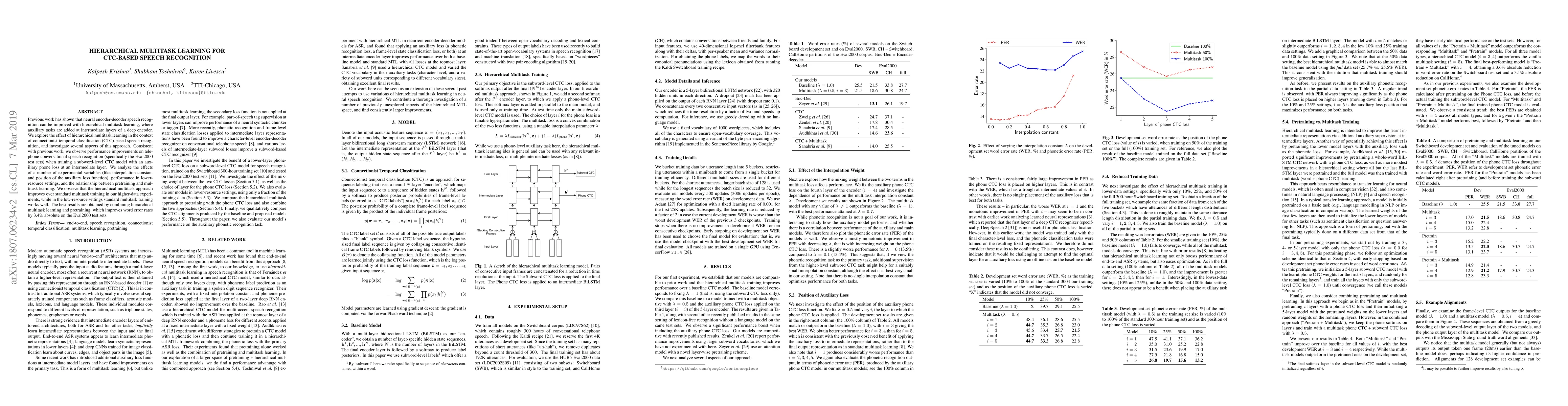 This paper investigates hierarchical multitask learning for CTC-based speech recognition, showing performance improvements on telephone speech data. The study finds that combining hierarchical multitask learning with pretraining yields the best results, reducing word error rates by 3.4% on the Eval2000 test sets.