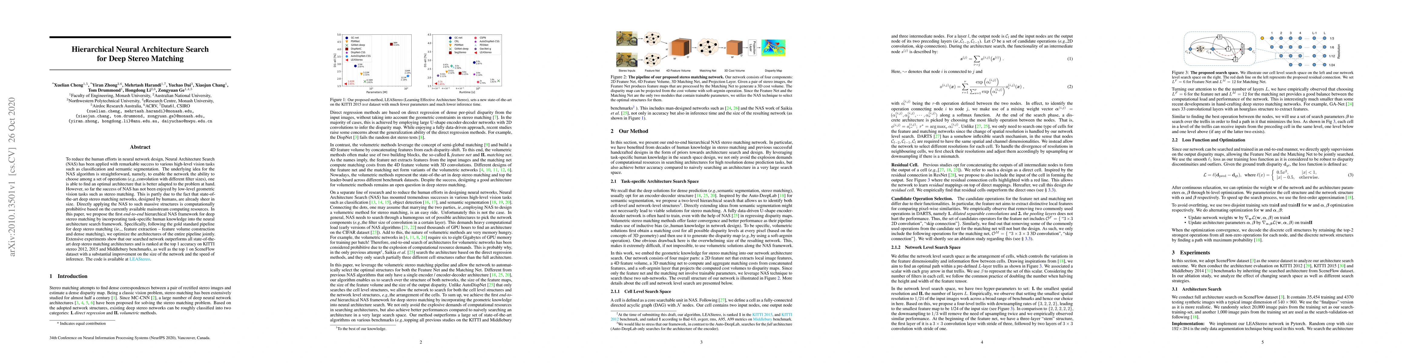 This paper introduces a hierarchical Neural Architecture Search (NAS) framework for optimizing deep stereo matching networks, incorporating human knowledge to manage computational costs. The proposed method searches for optimal architectures across the entire stereo matching pipeline, achieving top performance on multiple benchmarks while reducing network size and improving inference speed.