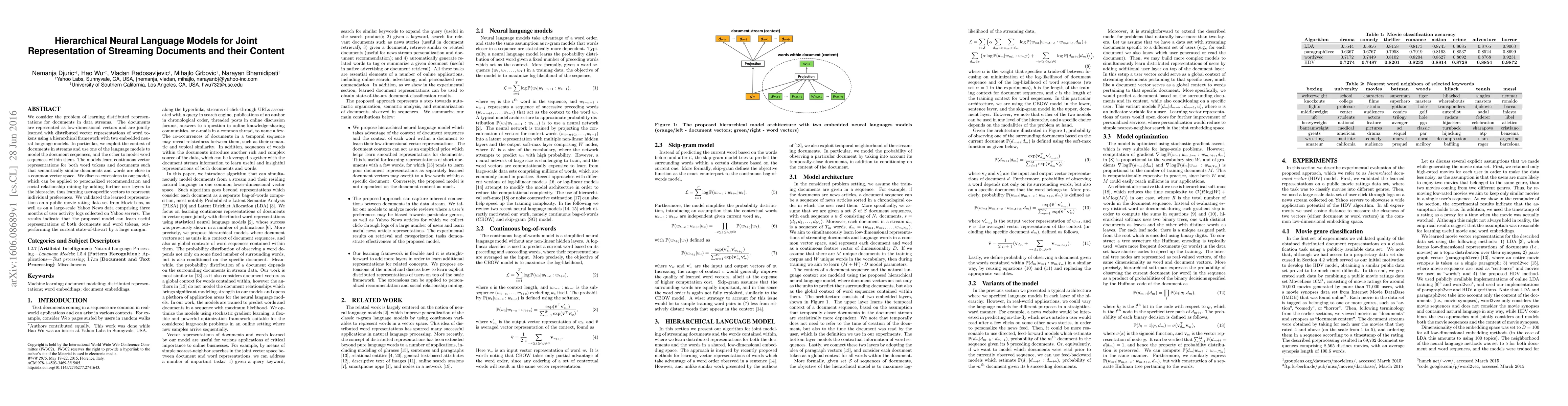 We consider the problem of learning distributed representations for documents in data streams. The documents are represented as low-dimensional vectors and are jointly learned with distributed vector representations of word tokens using a hierarchical framework with two embedded neural language models. In particular, we exploit the context of documents in streams and use one of the language models to model the document sequences, and the other to model word sequences within them. The models learn continuous vector representations for both word tokens and documents such that semantically similar documents and words are close in a common vector space. We discuss extensions to our model, which can be applied to personalized recommendation and social relationship mining by adding further user layers to the hierarchy, thus learning user-specific vectors to represent individual preferences. We validated the learned representations on a public movie rating data set from MovieLens, as well as on a large-scale Yahoo News data comprising three months of user activity logs collected on Yahoo servers. The results indicate that the proposed model can learn useful representations of both documents and word tokens, outperforming the current state-of-the-art by a large margin.