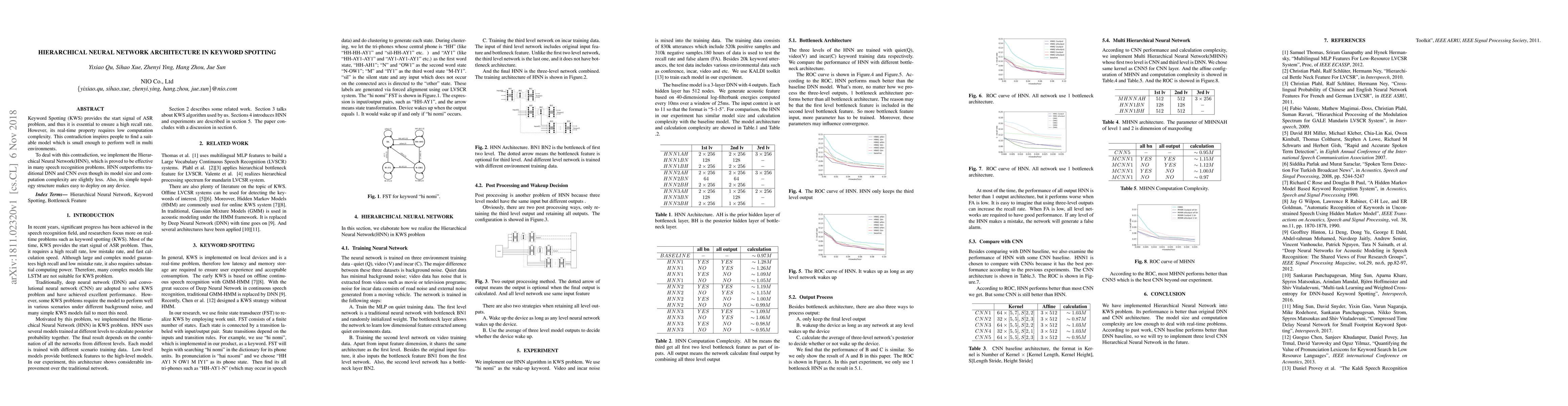 A hierarchical neural network architecture is proposed for keyword spotting, which consists of three levels: a first-level neural network with bottleneck layer BN1, a second-level neural network with bottleneck layer BN2, and a third-level neural network without bottleneck layer.