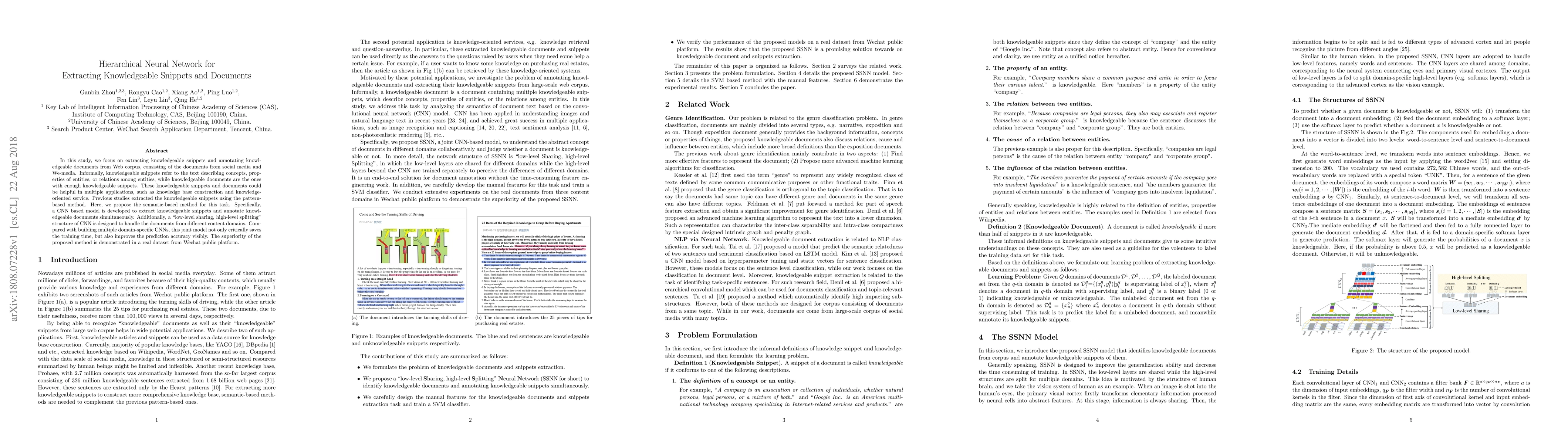 This research introduces a hierarchical neural network, specifically a CNN-based model, to extract and annotate knowledgeable snippets and documents from web corpus, including social media and We-media sources. The proposed semantic-based method aims to improve upon previous pattern-based extraction techniques, showcasing enhanced accuracy and efficiency through a "low-level sharing, high-level splitting" CNN structure, which also reduces training time compared to domain-specific models.