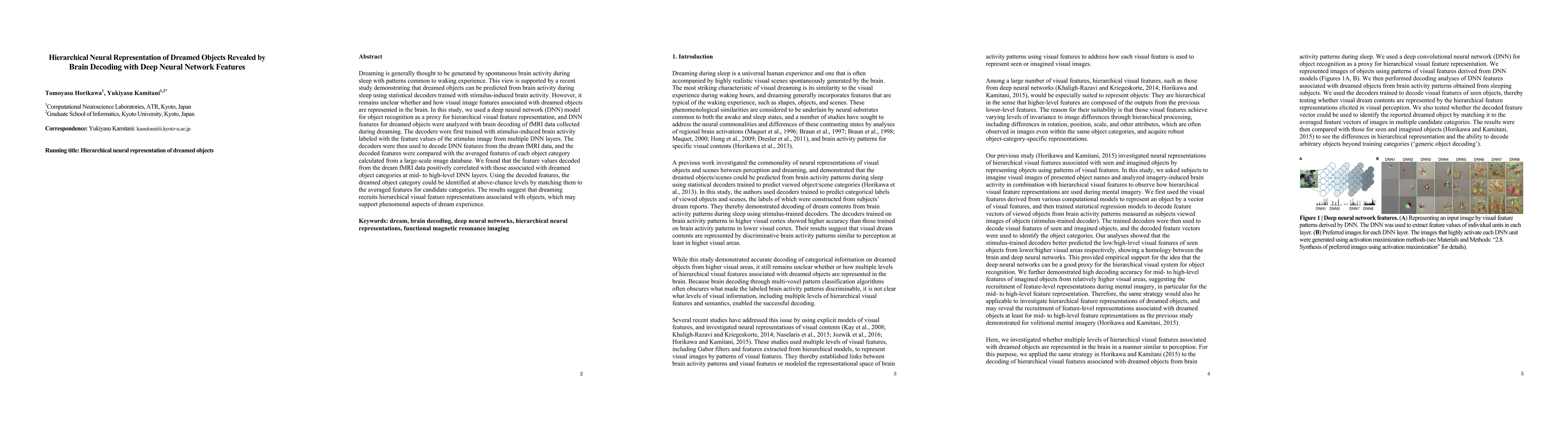 This study reveals that deep neural network features of dreamed objects correlate with brain activity during dreaming, suggesting that hierarchical visual representations are utilized in dream formation. The findings indicate that the brain encodes visual features of dreamed objects at mid- to high-level layers, supporting the phenomenal aspects of dream experiences.