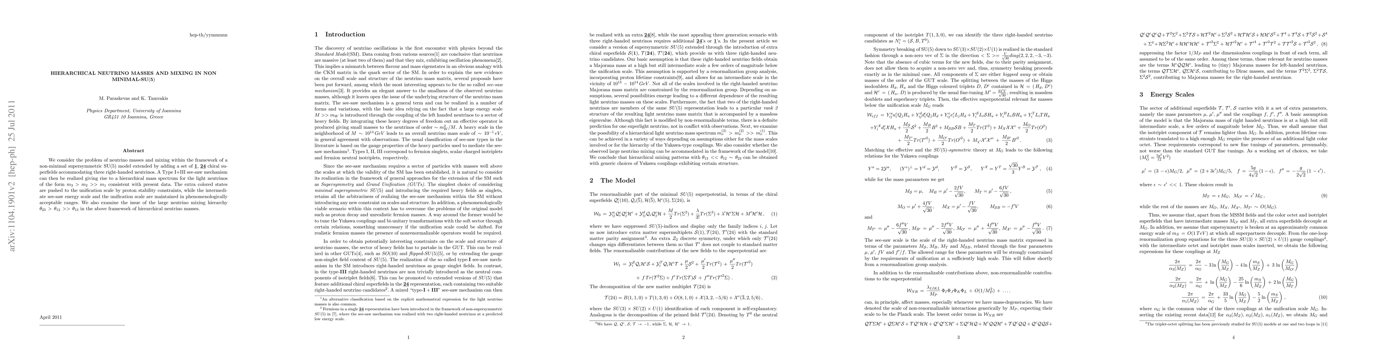 We consider the problem of neutrino masses and mixing within the framework of a non-minimal supersymmetric SU(5) model extended by adding a set of 1,24 chiral superfields accommodating three right-handed neutrinos. A Type I+III see-saw mechanism can then be realized giving rise to a hierarchical mass spectrum for the light neutrinos of the form m_3> m_2>> m_1 consistent with present data. The extra colored states are pushed to the unification scale by proton stability constraints, while the intermediate see-saw energy scale and the unification scale are maintained in phenomenologically acceptable ranges. We also examine the issue of large neutrino mixing hierarchy \theta_{23}> \theta_{12}>> \theta_{13} in the above framework of hierarchical neutrino masses.