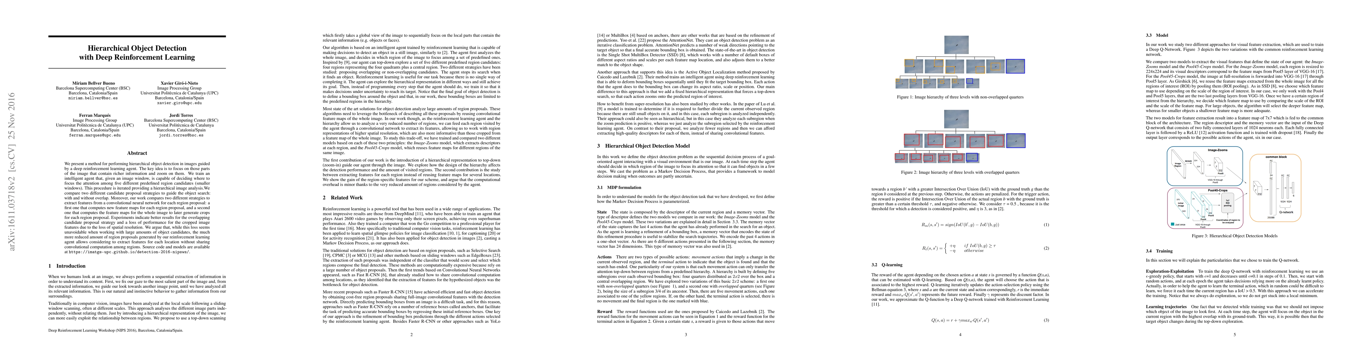 This paper proposes a hierarchical object detection method using deep reinforcement learning to focus on informative image regions. Experiments show better performance with overlapping candidate proposals and suggest that reduced region proposals allow for feature extraction without sharing convolutional computations.