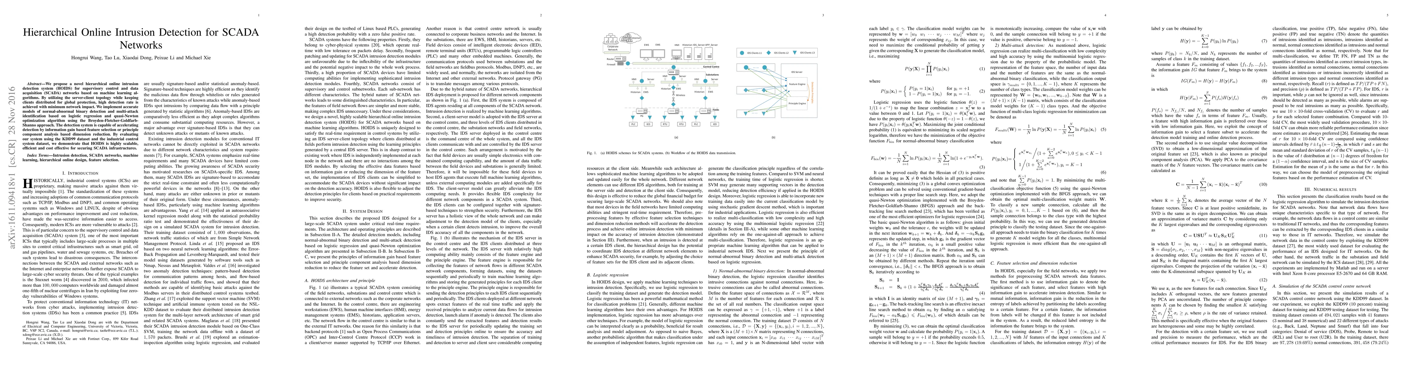 This paper introduces a hierarchical online intrusion detection system (HOIDS) for SCADA networks, employing machine learning for high detection rates and minimal network impact. The system uses logistic regression and optimization algorithms for accurate detection and employs feature selection and dimensionality reduction for efficiency.