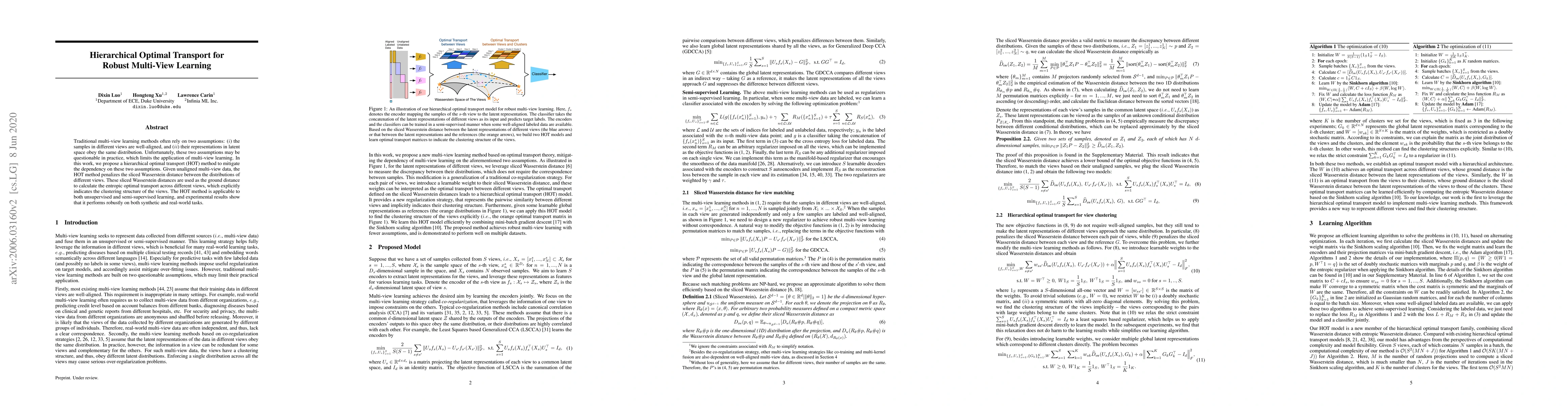 Traditional multi-view learning methods often rely on two assumptions: ($i$) the samples in different views are well-aligned, and ($ii$) their representations in latent space obey the same distribution. Unfortunately, these two assumptions may be questionable in practice, which limits the application of multi-view learning. In this work, we propose a hierarchical optimal transport (HOT) method to mitigate the dependency on these two assumptions. Given unaligned multi-view data, the HOT method penalizes the sliced Wasserstein distance between the distributions of different views. These sliced Wasserstein distances are used as the ground distance to calculate the entropic optimal transport across different views, which explicitly indicates the clustering structure of the views. The HOT method is applicable to both unsupervised and semi-supervised learning, and experimental results show that it performs robustly on both synthetic and real-world tasks.