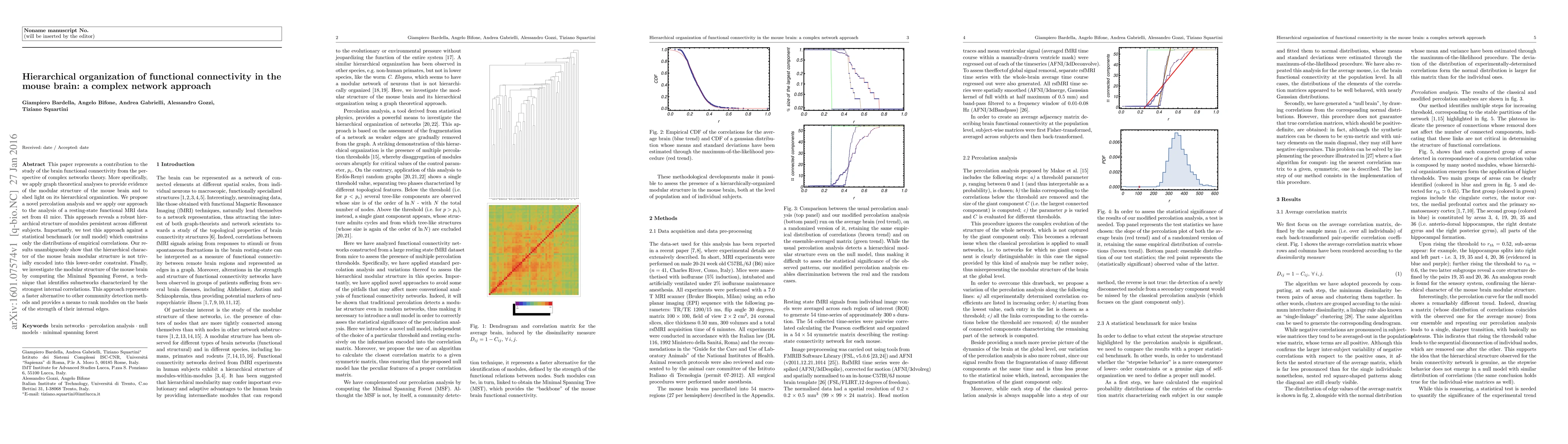 This paper represents a contribution to the study of the brain functional connectivity from the perspective of complex networks theory. More specifically, we apply graph theoretical analyses to provide evidence of the modular structure of the mouse brain and to shed light on its hierarchical organization. We propose a novel percolation analysis and we apply our approach to the analysis of a resting-state functional MRI data set from 41 mice. This approach reveals a robust hierarchical structure of modules persistent across different subjects. Importantly, we test this approach against a statistical benchmark (or null model) which constrains only the distributions of empirical correlations. Our results unambiguously show that the hierarchical character of the mouse brain modular structure is not trivially encoded into this lower-order constraint. Finally, we investigate the modular structure of the mouse brain by computing the Minimal Spanning Forest, a technique that identifies subnetworks characterized by the strongest internal correlations. This approach represents a faster alternative to other community detection methods and provides a means to rank modules on the basis of the strength of their internal edges.