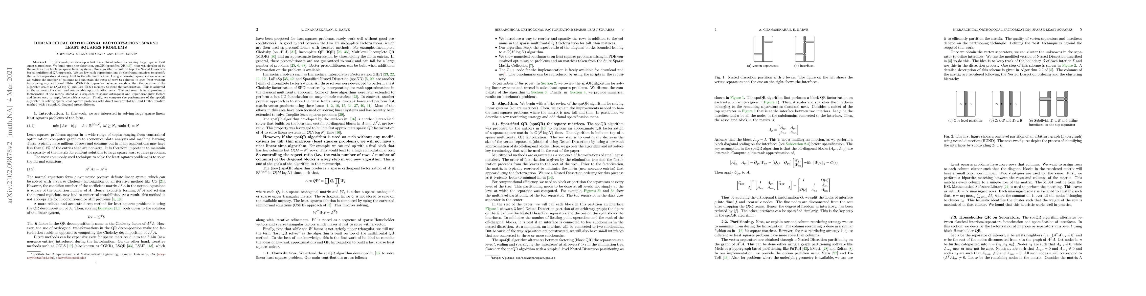 This paper introduces a fast hierarchical solver for large, sparse least squares problems, building on the spaQR algorithm. It employs a Nested Dissection-based multifrontal QR approach with low-rank approximations to sparsify frontal matrices, achieving $\mathcal{O}(M \log N)$ runtime and $\mathcal{O}(M)$ memory usage, with a small controllable approximation error.