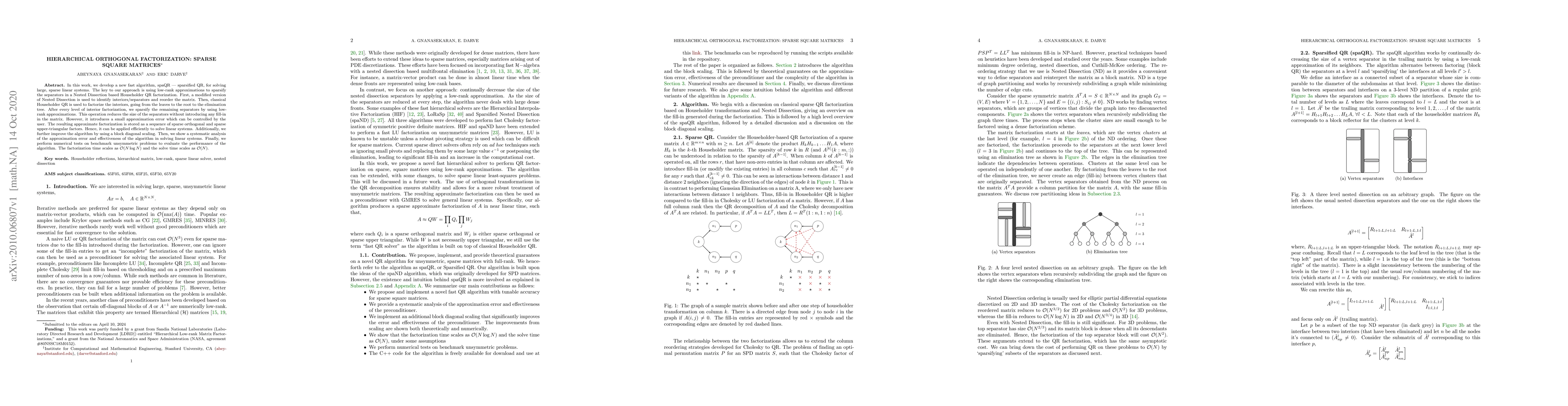 This paper introduces spaQR, a fast algorithm for solving large, sparse linear systems using hierarchical orthogonal factorization. The method employs low-rank approximations to sparsify separators in a Nested Dissection based Householder QR factorization, achieving $\mathcal{O}(N \log N)$ factorization time and $\mathcal{O}(N)$ solve time, while controlling approximation error.