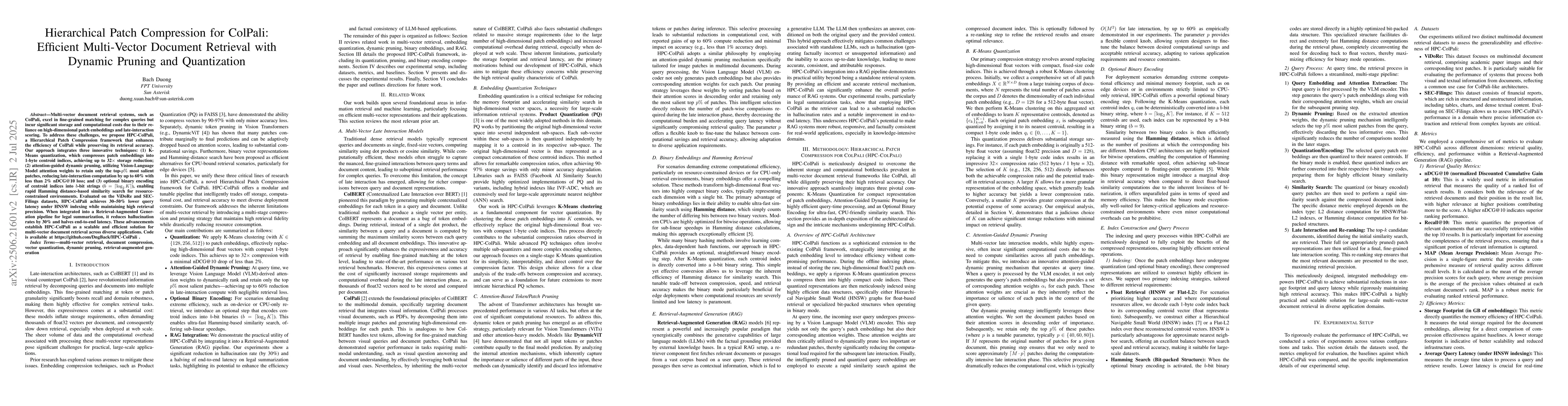 Multi-vector document retrieval systems, such as ColPali, excel in fine-grained matching for complex queries but incur significant storage and computational costs due to their reliance on high-dimensional patch embeddings and late-interaction scoring. To address these challenges, we propose HPC-ColPali, a Hierarchical Patch Compression framework that enhances the efficiency of ColPali while preserving its retrieval accuracy. Our approach integrates three innovative techniques: (1) K-Means quantization, which compresses patch embeddings into 1-byte centroid indices, achieving up to 32$\times$ storage reduction; (2) attention-guided dynamic pruning, utilizing Vision-Language Model attention weights to retain only the top-$p\%$ most salient patches, reducing late-interaction computation by up to 60\% with less than 2\% nDCG@10 loss; and (3) optional binary encoding of centroid indices into $b$-bit strings ($b=\lceil\log_2 K\rceil$), enabling rapid Hamming distance-based similarity search for resource-constrained environments. Evaluated on the ViDoRe and SEC-Filings datasets, HPC-ColPali achieves 30--50\% lower query latency under HNSW indexing while maintaining high retrieval precision. When integrated into a Retrieval-Augmented Generation pipeline for legal summarization, it reduces hallucination rates by 30\% and halves end-to-end latency. These advancements establish HPC-ColPali as a scalable and efficient solution for multi-vector document retrieval across diverse applications. Code is available at https://github.com/DngBack/HPC-ColPali.