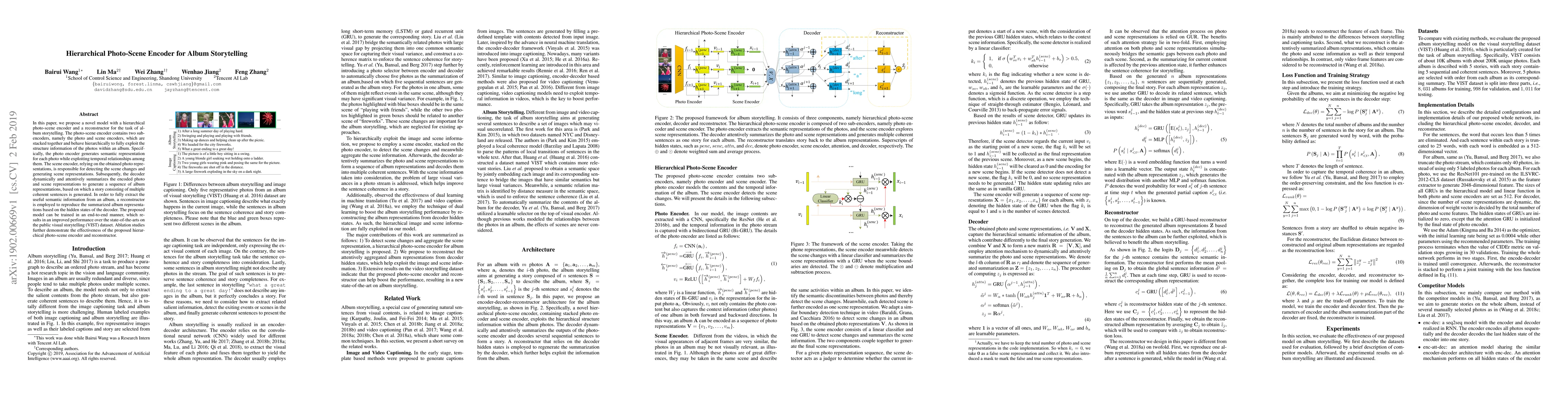 This paper introduces a hierarchical photo-scene encoder and reconstructor to enhance album storytelling by generating coherent sentences. The model extracts semantic representations from photos and detects scene changes, then summarizes these to create a story, with an end-to-end training approach outperforming existing methods.