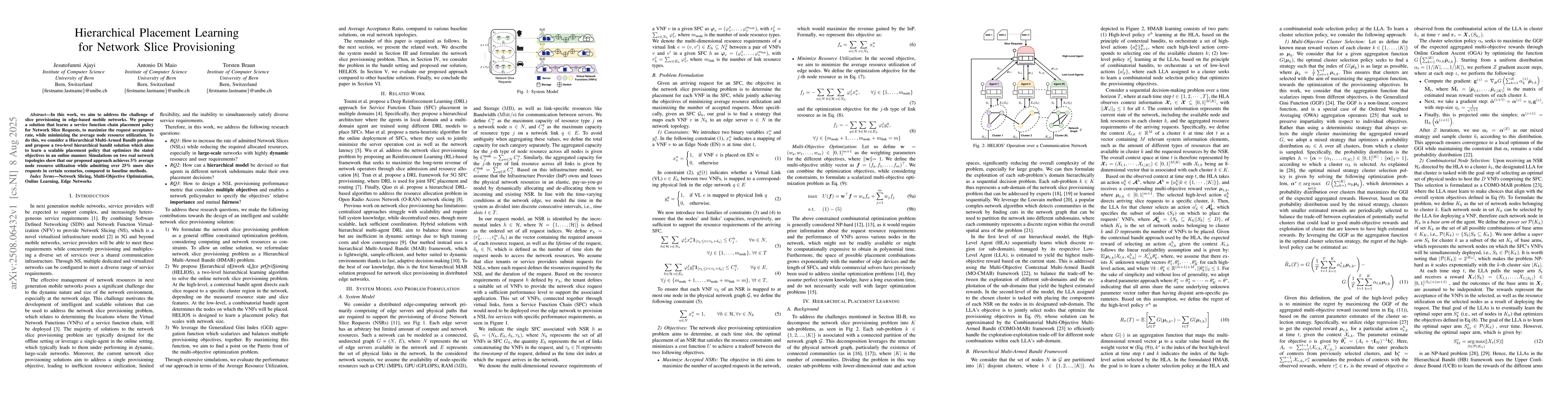 In this work, we aim to address the challenge of slice provisioning in edge-based mobile networks. We propose a solution that learns a service function chain placement policy for Network Slice Requests, to maximize the request acceptance rate, while minimizing the average node resource utilization. To do this, we consider a Hierarchical Multi-Armed Bandit problem and propose a two-level hierarchical bandit solution which aims to learn a scalable placement policy that optimizes the stated objectives in an online manner. Simulations on two real network topologies show that our proposed approach achieves 5% average node resource utilization while admitting over 25% more slice requests in certain scenarios, compared to baseline methods.