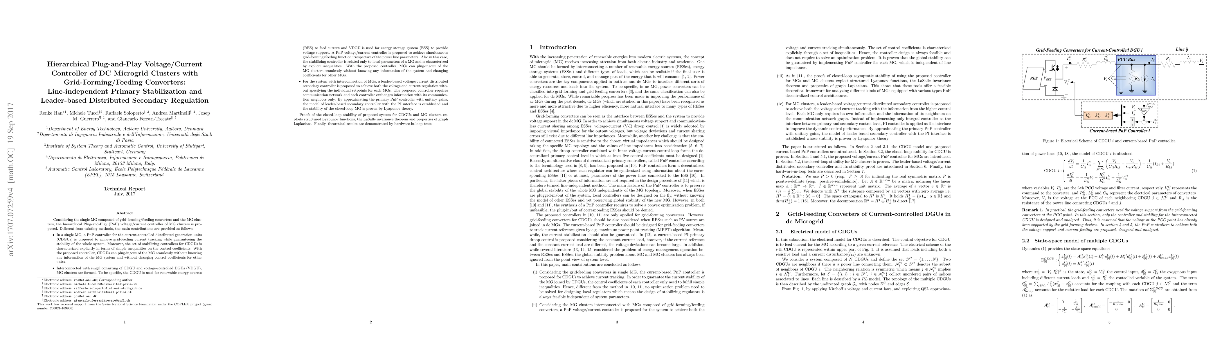 Considering the structure of dc Microgrids (MGs) composed of grid-forming/feeding converters, a hierarchical Plug-and-Play (PnP) voltage/current control architecture for MG clusters is proposed. In the primary level, a PnP voltage/current controller is proposed to achieve simultaneous voltage support and current feeding function according to local references. In addition, stabilizing controller is characterized by explicit inequalities which are only related to local parameters of a MG. In the secondary level, for the system with interconnection of MGs, a leader-based voltage/current distributed controller is proposed to achieve both voltage and current regulation without specifying the individual setpoints for each MG. The proposed controller requires a communication network and each controller exchanges information with its communication neighbors only. With the proposed controller, each MG can plug-in/out of the system seamlessly, irrespectively of the power line parameters and models of other MGs . The proof of the MG cluster closed-loop stability exploits structured Lyapunov functions, the LaSalle invariance theorem and properties of graph Laplacians. Theoretical results are validated by hardware-in-loop (HiL) tests.