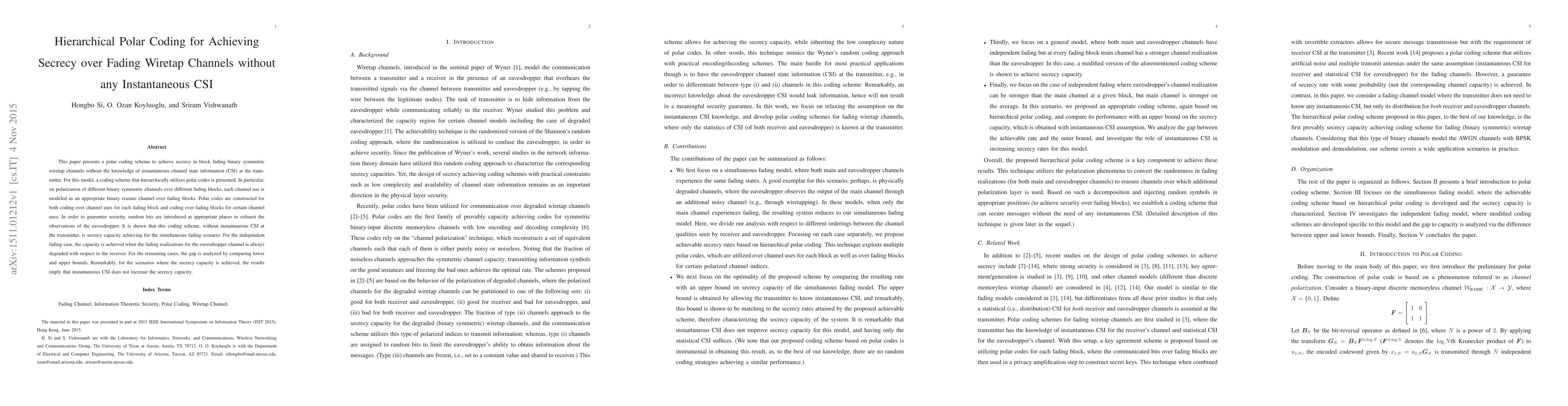 This paper introduces a polar coding scheme to secure block fading wiretap channels without instantaneous channel state information, achieving secrecy capacity through hierarchical polar codes and random bits to confuse eavesdroppers. The method is shown to be capacity-achieving in certain fading scenarios, proving that instantaneous CSI is unnecessary.