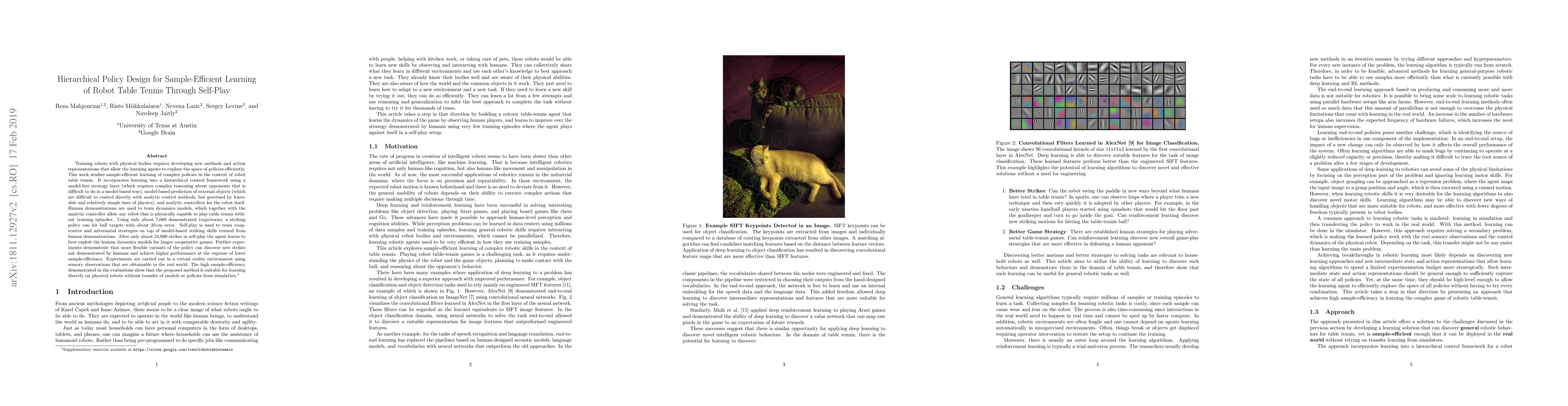 This paper proposes a hierarchical policy design for sample-efficient learning of robot table tennis through self-play, combining model-free, model-based, and analytic control methods. The approach achieves high performance with minimal human demonstrations and self-play, enabling robots to learn directly from physical interactions.