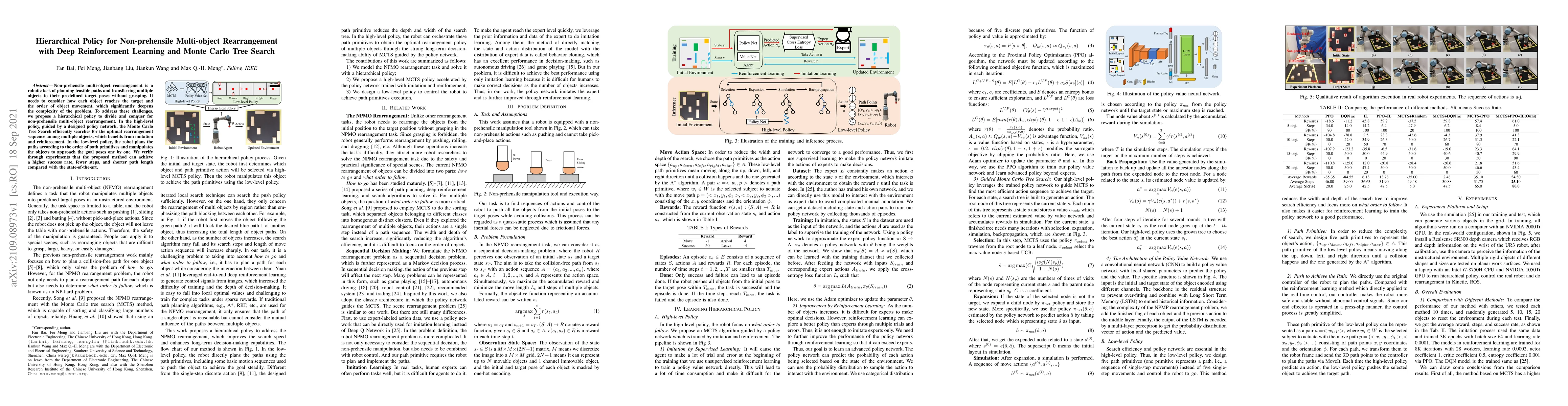 This paper proposes a hierarchical policy combining deep reinforcement learning and Monte Carlo Tree Search for non-prehensile multi-object rearrangement, achieving higher success rates, fewer steps, and shorter path lengths compared to existing methods. The high-level policy uses Monte Carlo Tree Search to determine optimal object rearrangement sequences, while the low-level policy handles path planning and object manipulation.
