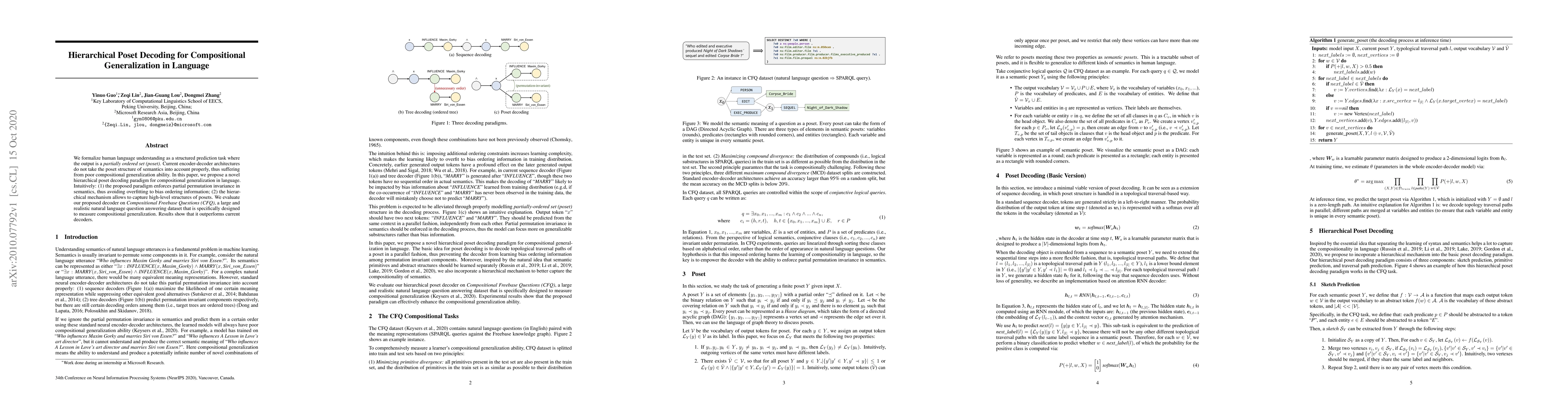 We formalize human language understanding as a structured prediction task where the output is a partially ordered set (poset). Current encoder-decoder architectures do not take the poset structure of semantics into account properly, thus suffering from poor compositional generalization ability. In this paper, we propose a novel hierarchical poset decoding paradigm for compositional generalization in language. Intuitively: (1) the proposed paradigm enforces partial permutation invariance in semantics, thus avoiding overfitting to bias ordering information; (2) the hierarchical mechanism allows to capture high-level structures of posets. We evaluate our proposed decoder on Compositional Freebase Questions (CFQ), a large and realistic natural language question answering dataset that is specifically designed to measure compositional generalization. Results show that it outperforms current decoders.