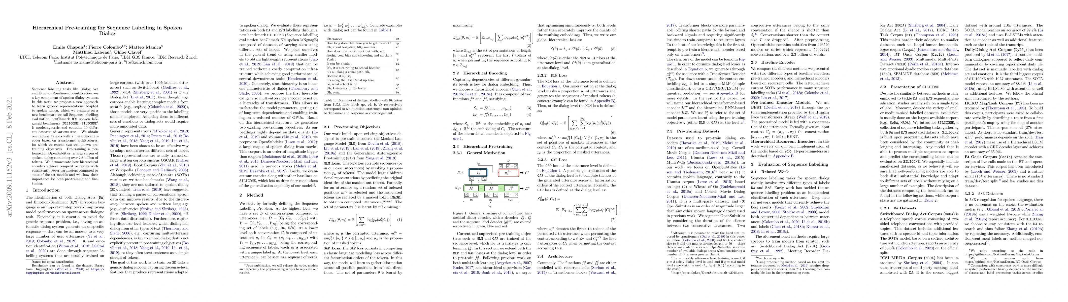 This paper proposes a new hierarchical pre-training approach using transformer-based encoders for sequence labelling tasks in spoken dialog systems, evaluated on the new \texttt{SILICONE} benchmark. The method achieves competitive results with fewer parameters compared to state-of-the-art models, demonstrating the importance of hierarchical pre-training for both pre-training and fine-tuning.