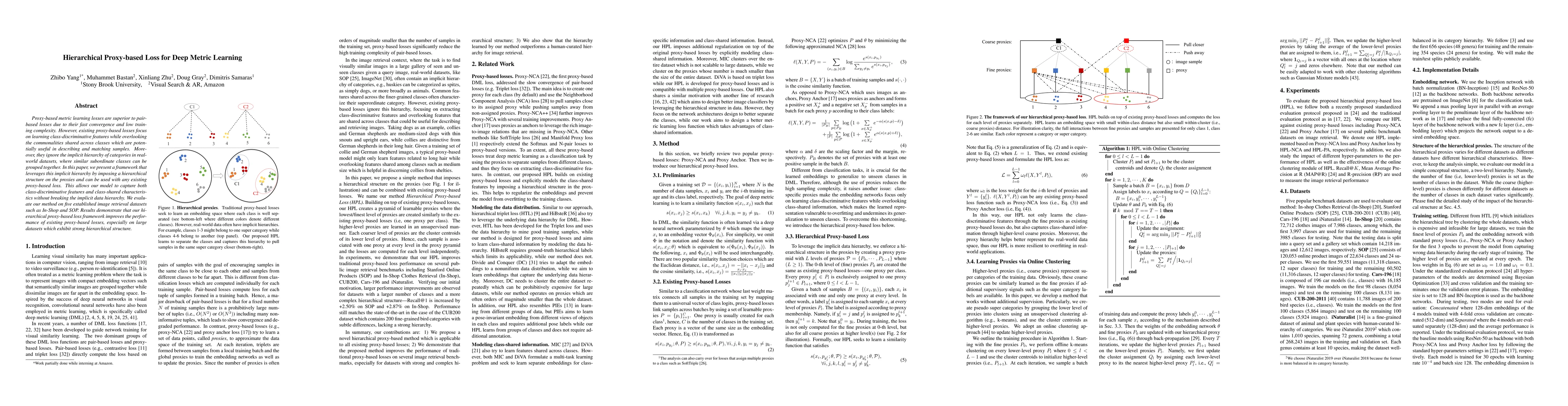 This paper proposes a hierarchical proxy-based loss framework for deep metric learning that leverages the implicit category hierarchy in datasets to capture both class-specific and shared features. The method enhances existing proxy-based losses, demonstrating improved performance on large datasets with strong hierarchical structures.