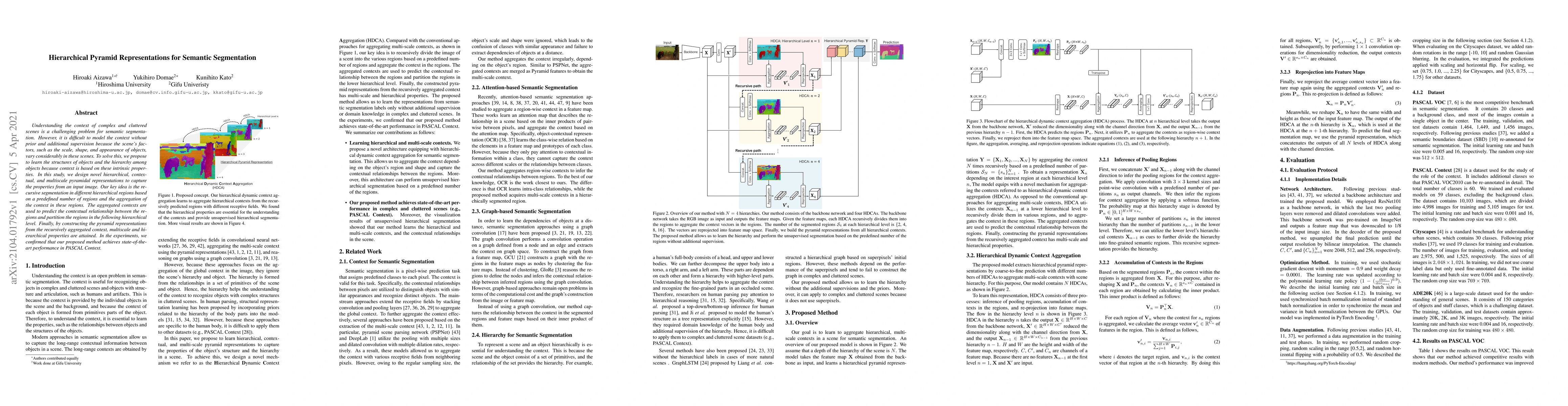 Understanding the context of complex and cluttered scenes is a challenging problem for semantic segmentation. However, it is difficult to model the context without prior and additional supervision because the scene's factors, such as the scale, shape, and appearance of objects, vary considerably in these scenes. To solve this, we propose to learn the structures of objects and the hierarchy among objects because context is based on these intrinsic properties. In this study, we design novel hierarchical, contextual, and multiscale pyramidal representations to capture the properties from an input image. Our key idea is the recursive segmentation in different hierarchical regions based on a predefined number of regions and the aggregation of the context in these regions. The aggregated contexts are used to predict the contextual relationship between the regions and partition the regions in the following hierarchical level. Finally, by constructing the pyramid representations from the recursively aggregated context, multiscale and hierarchical properties are attained. In the experiments, we confirmed that our proposed method achieves state-of-the-art performance in PASCAL Context.