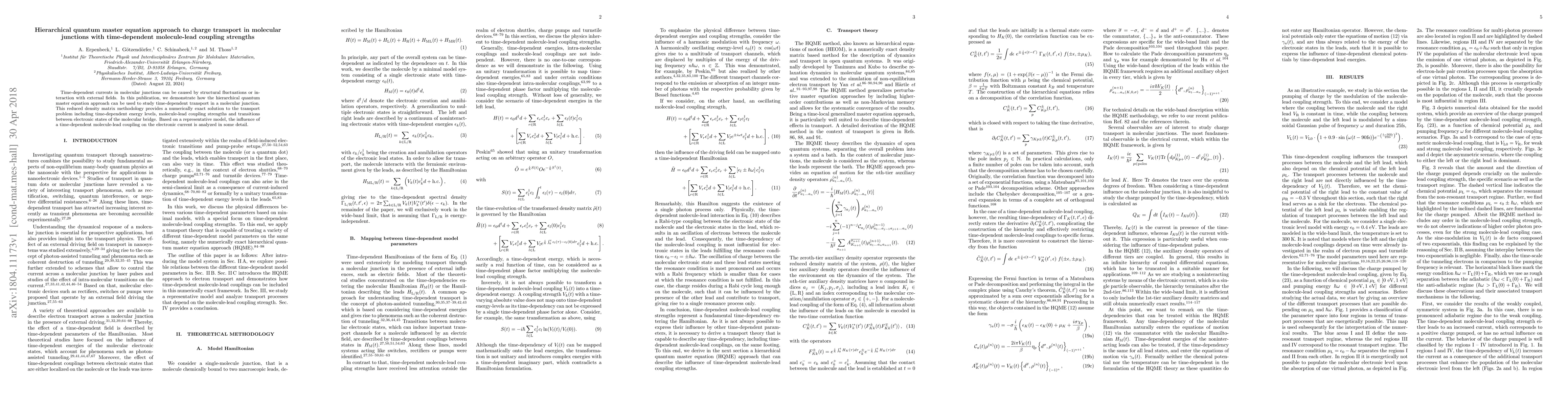Time-dependent currents in molecular junctions can be caused by structural fluctuations or interaction with external fields. In this publication, we demonstrate how the hierarchical quantum master equation approach can be used to study time-dependent transport in a molecular junction. This reduced density matrix methodology provides a numerically exact solution to the transport problem including time-dependent energy levels, molecule-lead coupling strengths and transitions between electronic states of the molecular bridge. Based on a representative model, the influence of a time-dependent molecule-lead coupling on the electronic current is analyzed in some detail.