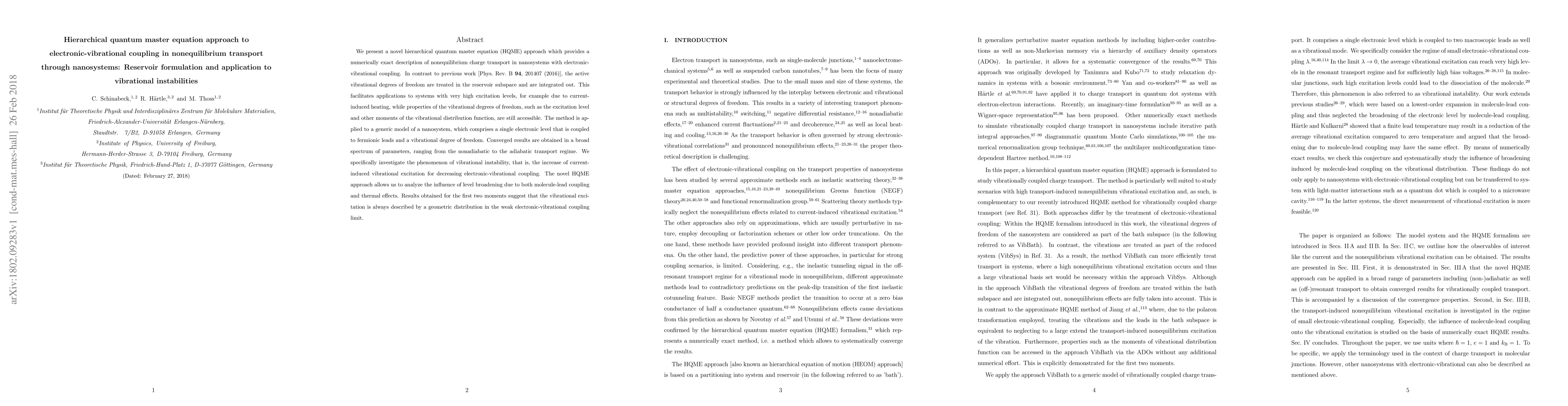 This paper introduces a hierarchical quantum master equation approach for nonequilibrium transport in nanosystems, focusing on electronic-vibrational coupling. It enables a numerically exact treatment of high excitation levels, particularly current-induced heating, and analyzes vibrational instability through the increase in current-induced vibrational excitation with decreasing coupling.