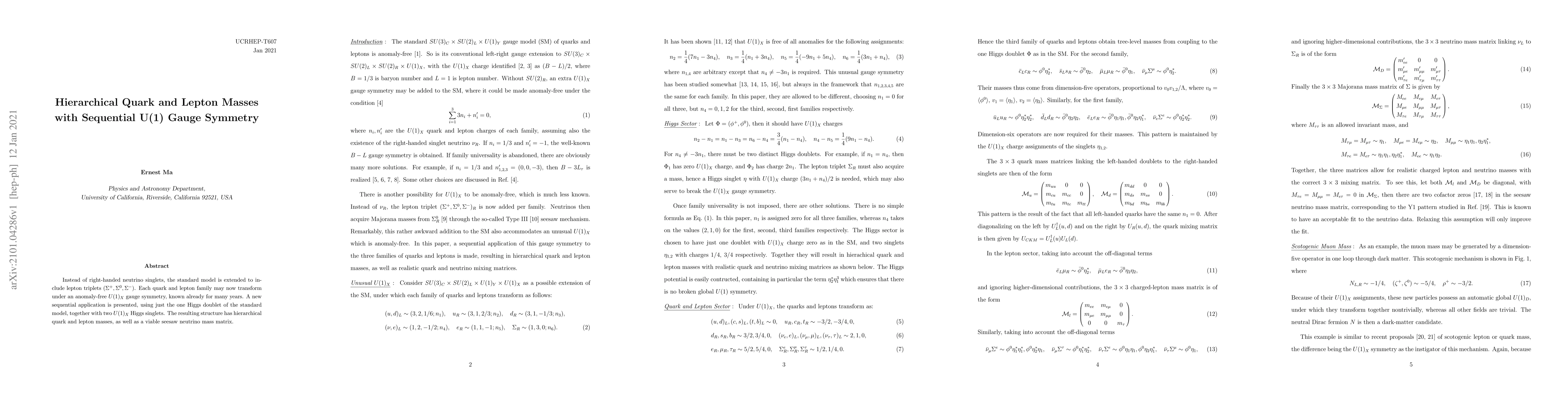 Instead of right-handed neutrino singlets, the standard model is extended to include lepton triplets $(\Sigma^+, \Sigma^0, \Sigma^-)$. Each quark and lepton family may now transform under an anomaly-free $U(1)_X$ gauge symmetry, known already for many years. A new sequential application is presented, using just the one Higgs doublet of the standard model, together with two $U(1)_X$ Higgs singlets. The resulting structure has hierarchical quark and lepton masses, as well as a viable seesaw neutrino mass matrix.