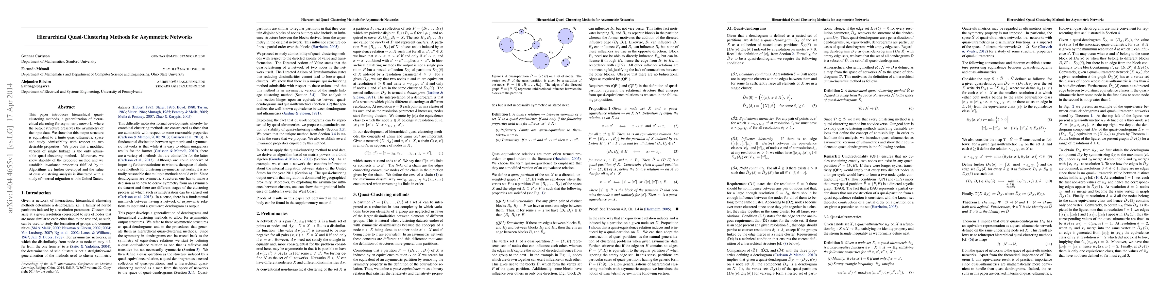 This paper proposes hierarchical quasi-clustering methods for asymmetric networks, demonstrating their equivalence to finite quasi-ultrametric spaces and proving that a modified single linkage is the only admissible method. The study also highlights the stability and invariance properties of the method, illustrated through an analysis of internal migration in the United States.