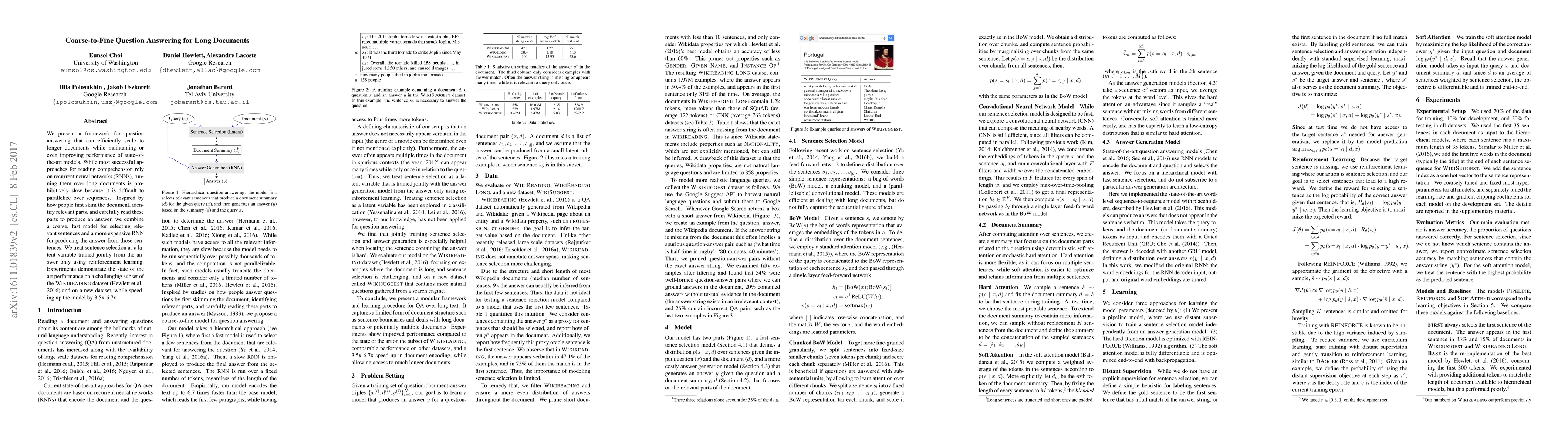 This paper proposes a hierarchical question answering framework that scales efficiently for long documents by first selecting relevant sentences using a fast model and then applying a more complex RNN to produce answers. The method achieves state-of-the-art performance and speeds up processing by 3.5x-6.7x.