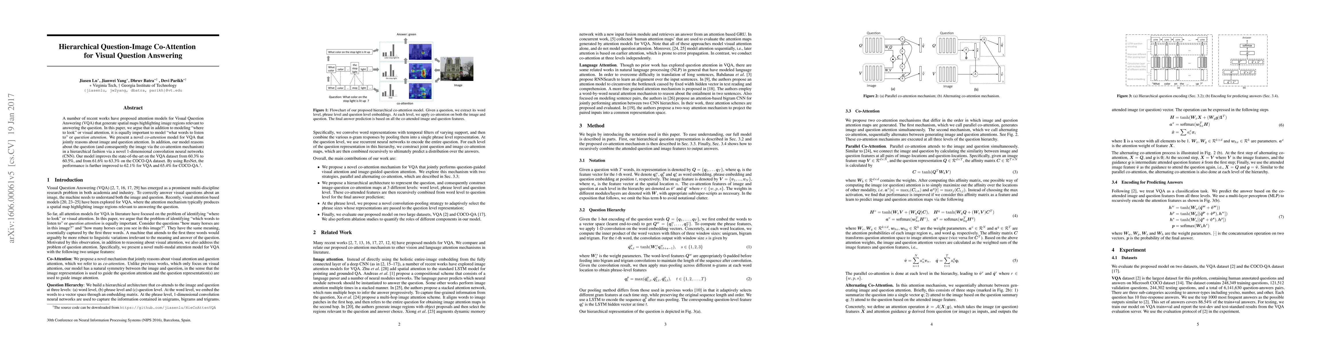This paper introduces a hierarchical question-image co-attention model for Visual Question Answering (VQA) that jointly considers visual and question attention. The model employs a 1-dimensional CNN for hierarchical question reasoning and improves state-of-the-art performance on VQA and COCO-QA datasets, further enhanced by using ResNet.